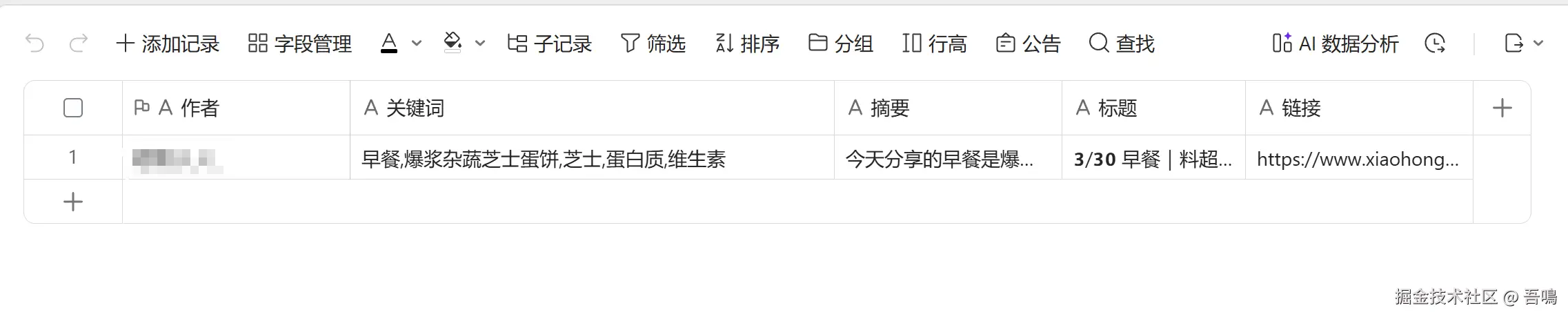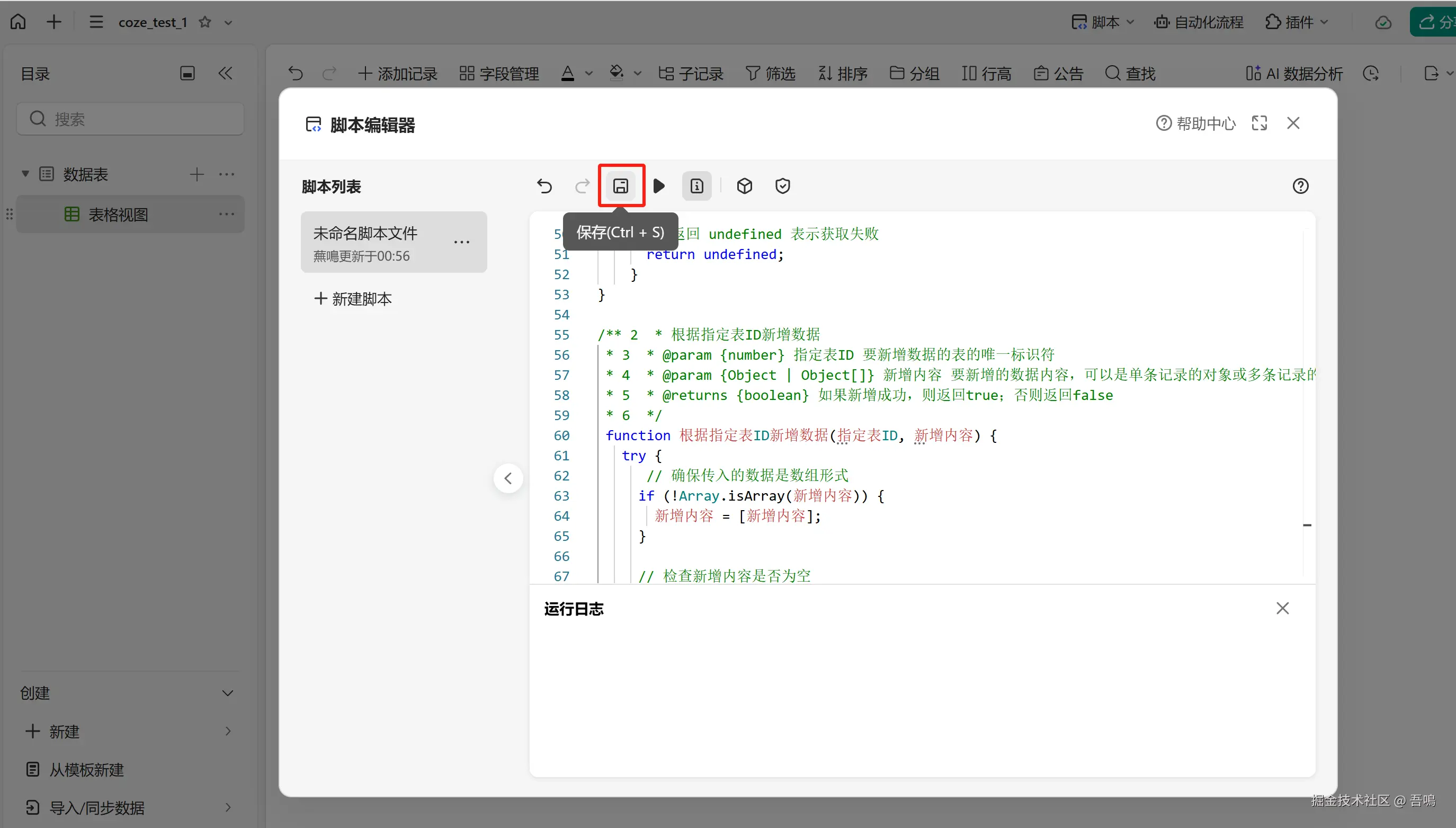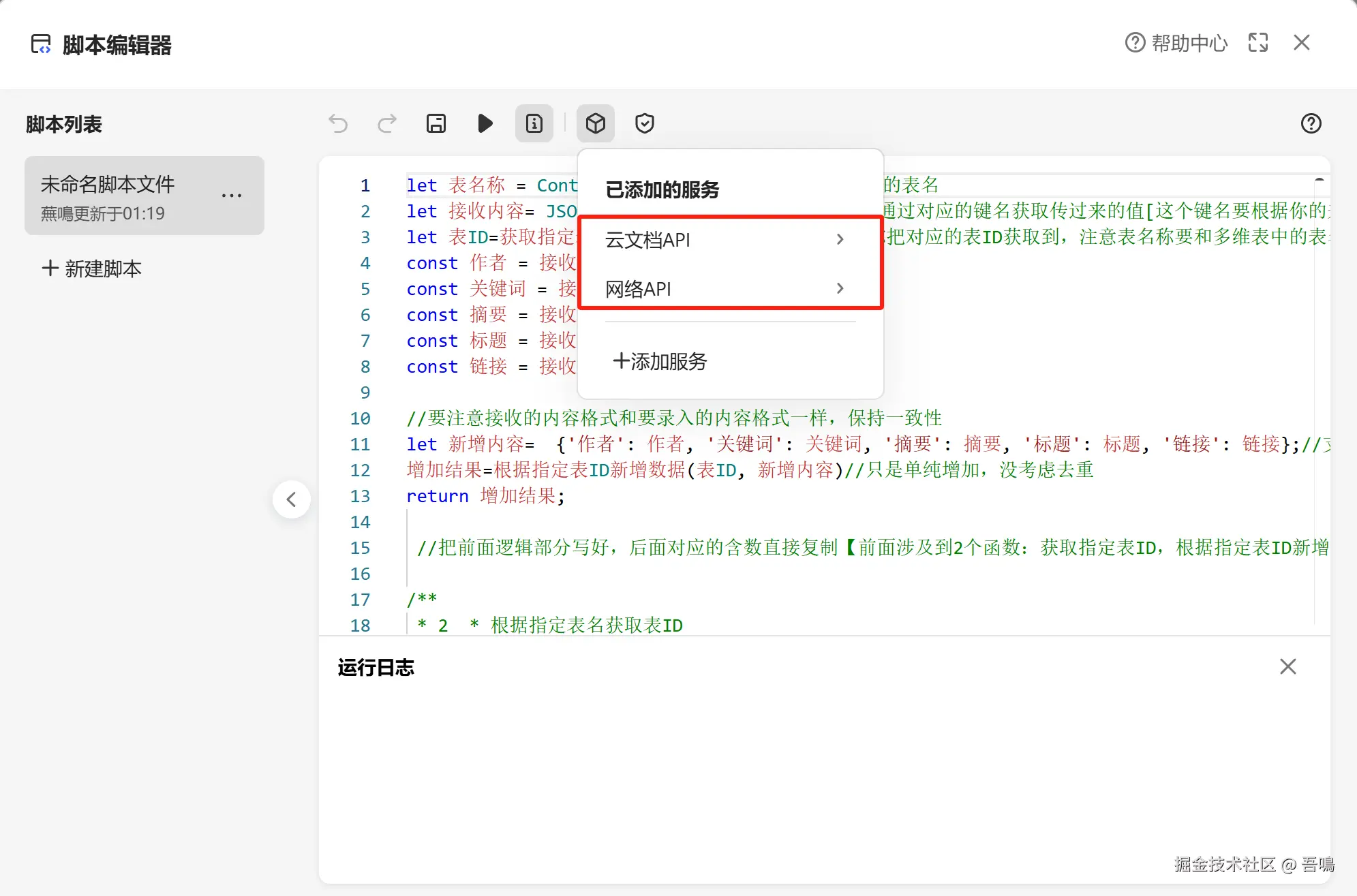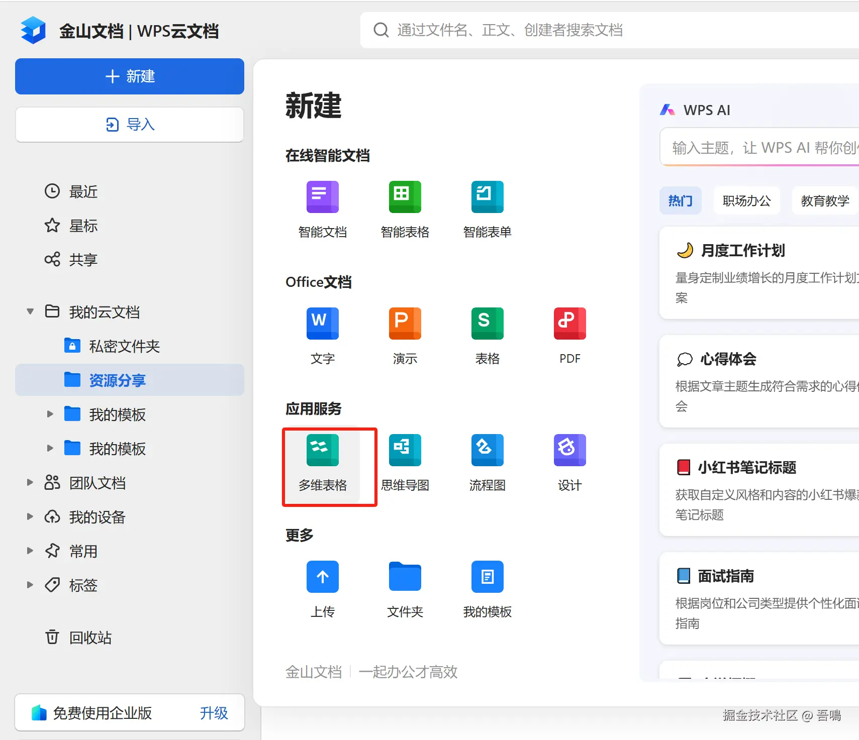 要写入金山文档多维表格,首先我们需要到金山文档上创建一个多维表格,创建好多维表格后,需要新建脚本,编写脚本内容(脚本内容,吾鳴已经和大模型节点中的提示词一起打包放到了文末)。