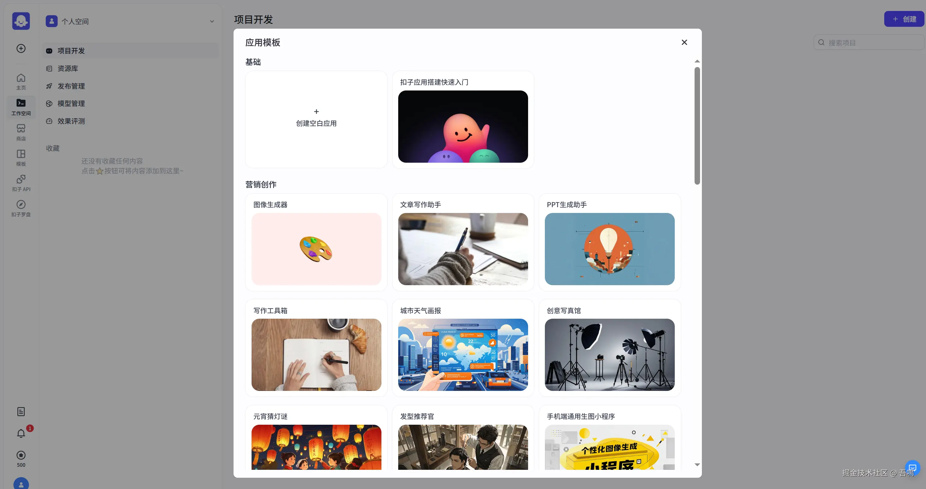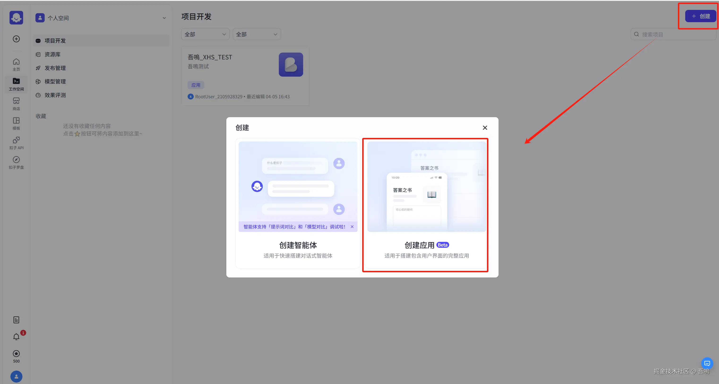 进入到扣子(coze)首页后,找到左侧的菜单栏,点击工作空间,选择项目开发;然后再点击右上角的创建按钮,会弹出下面的框框,选择创建应用,我们本次先介绍如何搭建AI应用。
