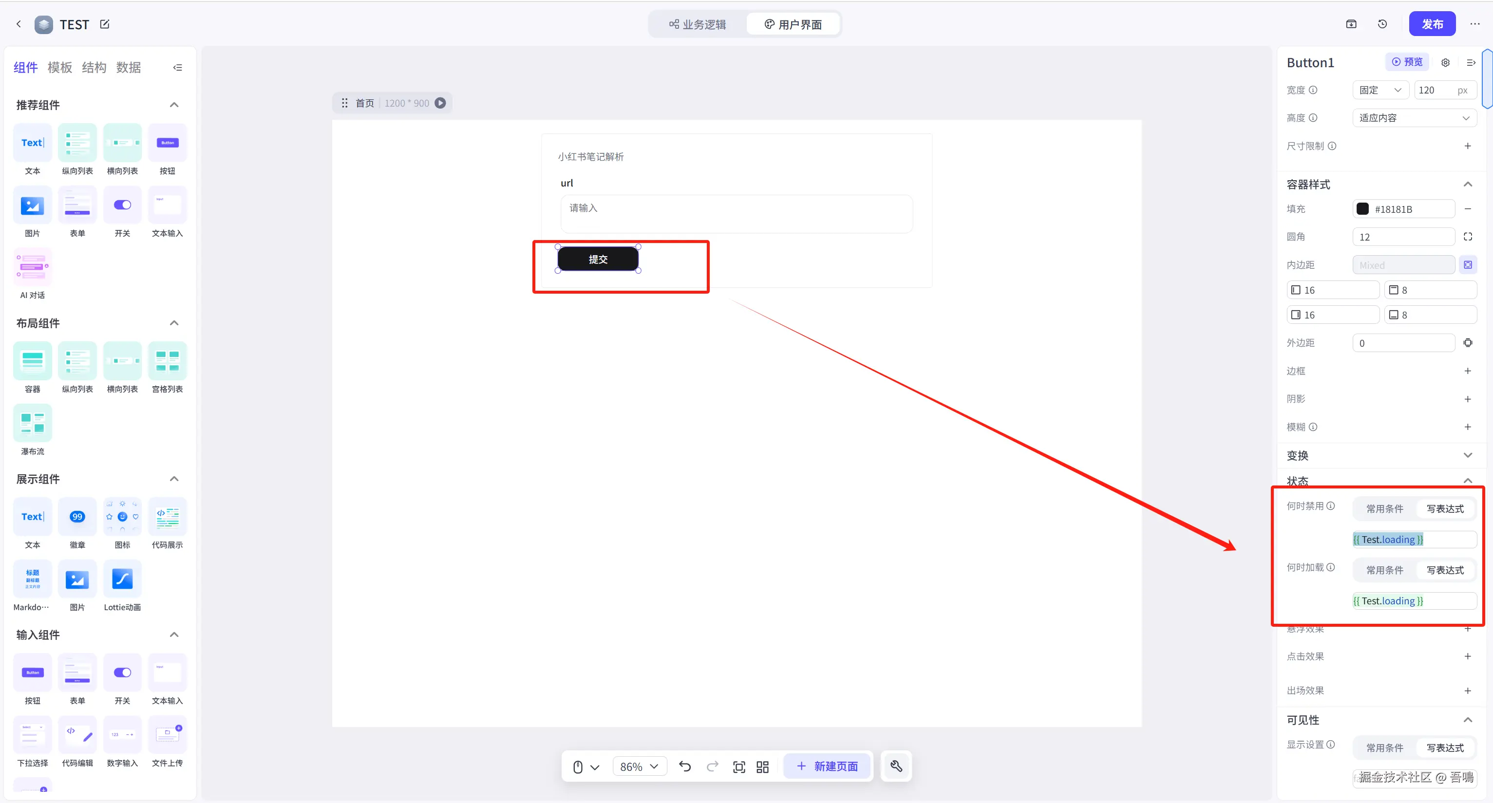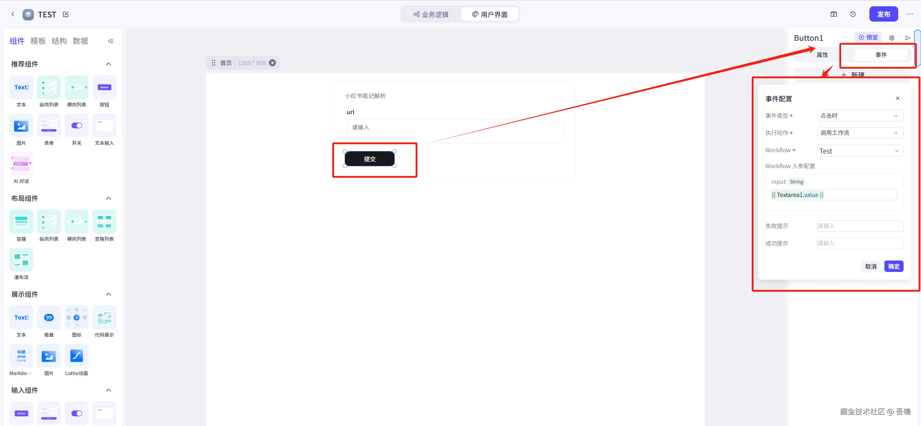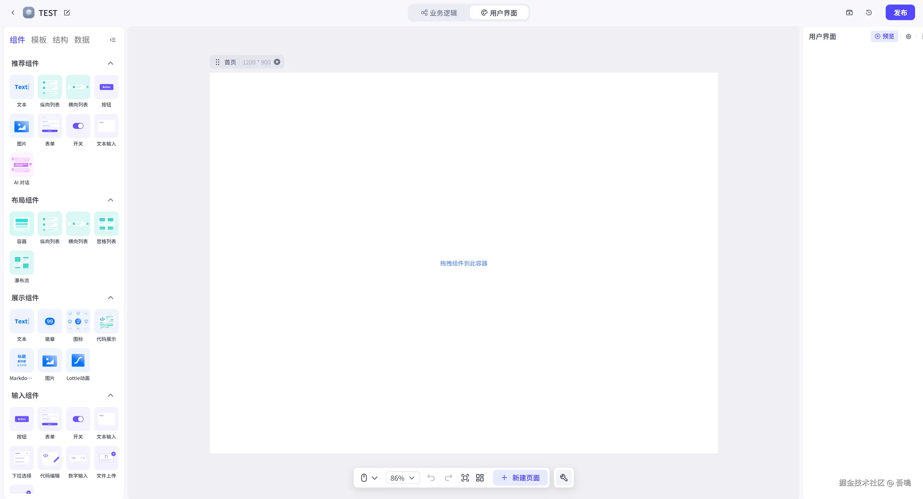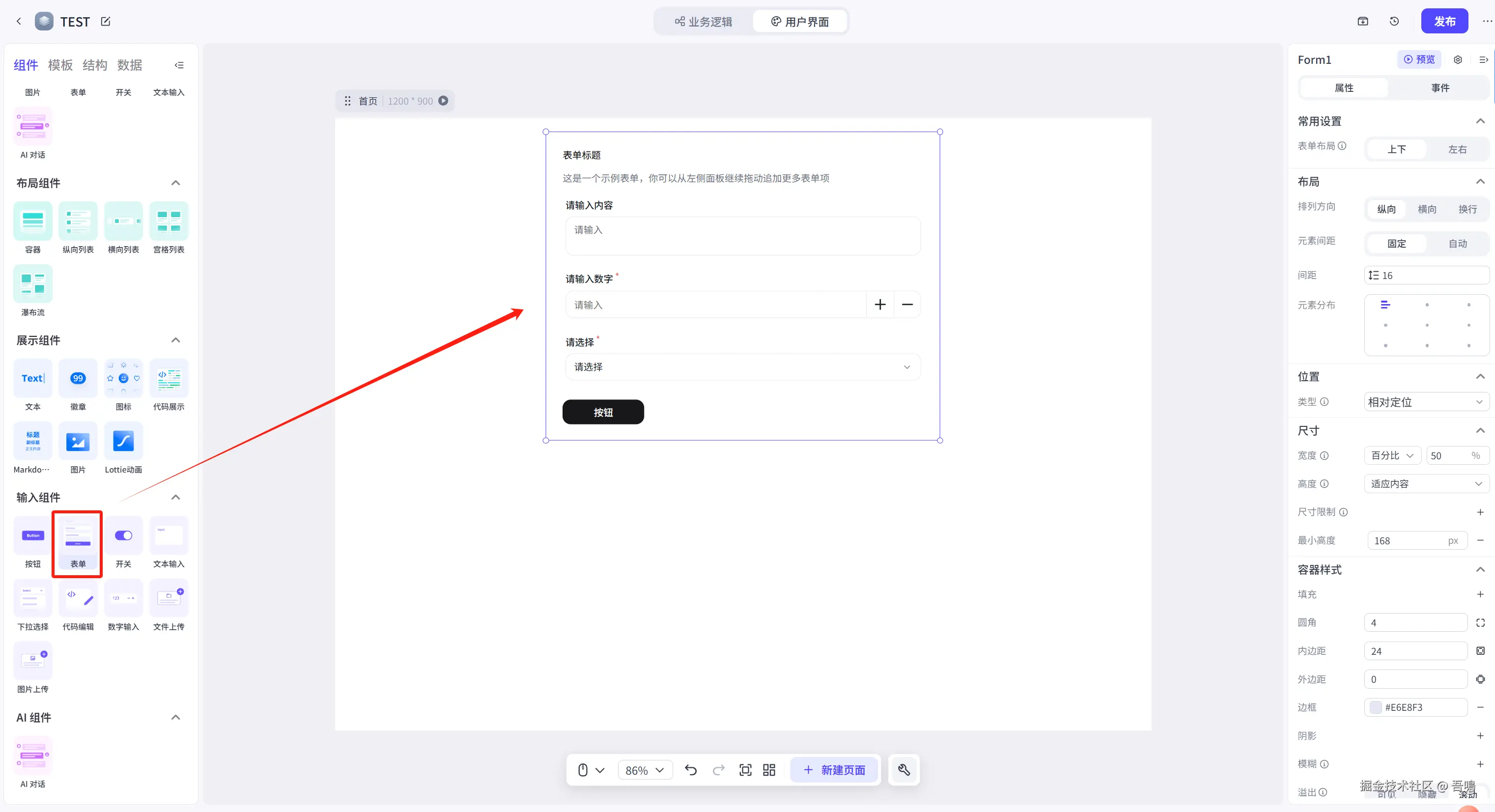 进入到上面的图片的页面,可以看到左侧菜单栏有很多的UI组件,你们需要什么就拖拽到中间的容器中即可。因为吾鳴是需要提交小红薯笔记链接,所以我就拖拽一个表单组件。