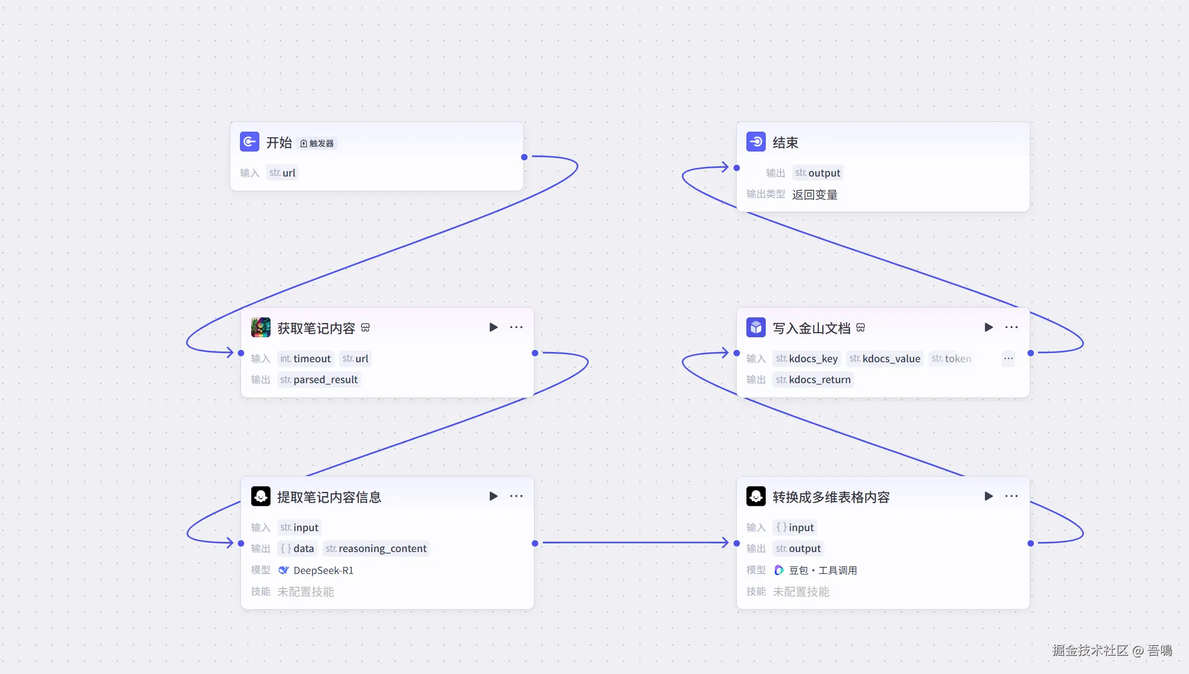 工作流主要有获取笔记内容、利用大模型提取笔记内容信息、把提取到的笔记内容信息转换为金山表格的格式、写笔记信息到金山多维表格。这个工作流搭建也不是很复杂,除了金山多维表格需要写个脚本写入内容到金山表格外(脚本已备好,复制黏贴即可),其他的都是页面上操作即可。