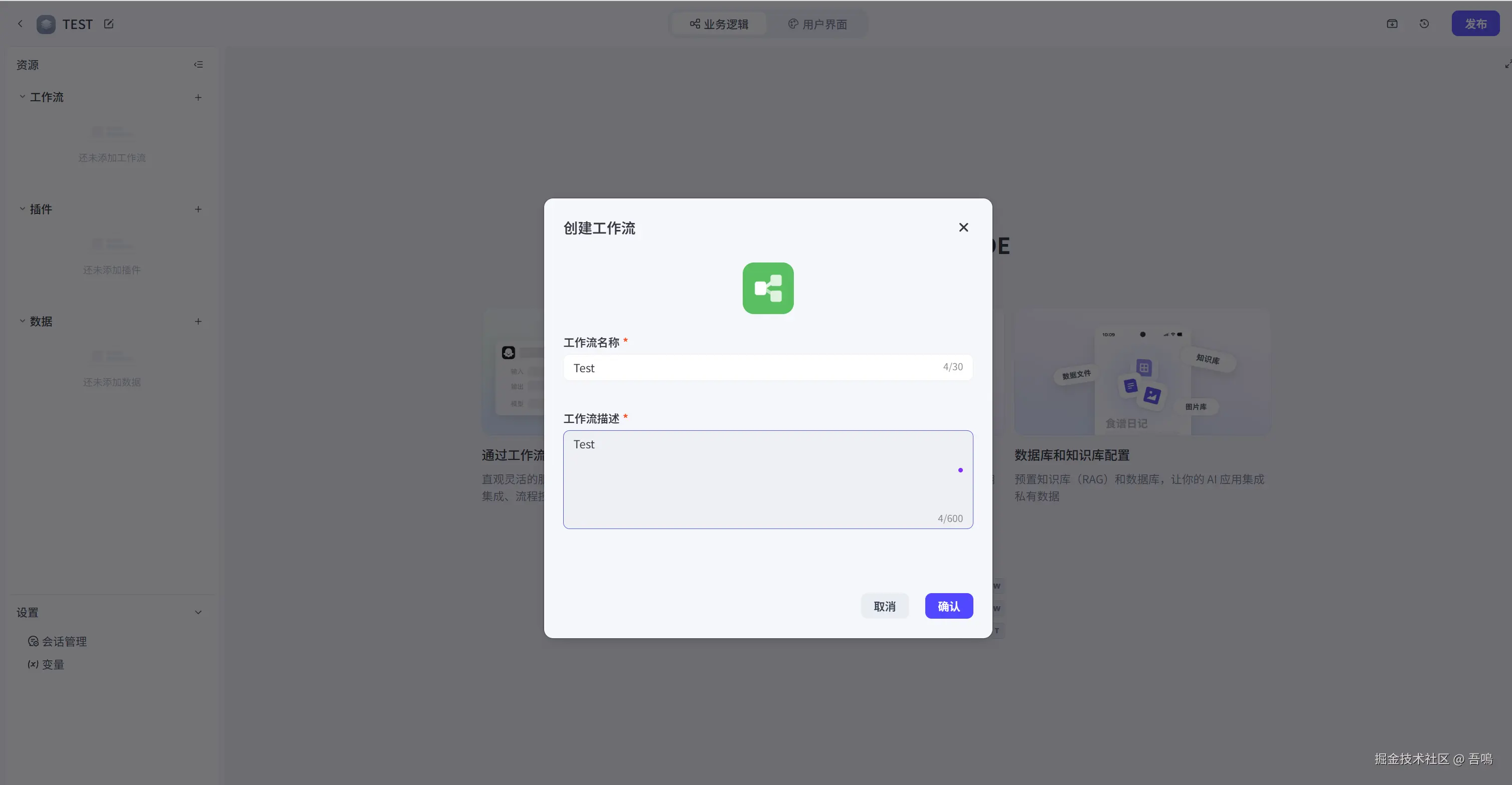 首先,需要新建一个工作流,左侧菜单栏,工作流最右边的加号,点击添加工作流。输入工作流名称和工作流描述。工作流创建好之后,就可以看到开始节点和结束节点。