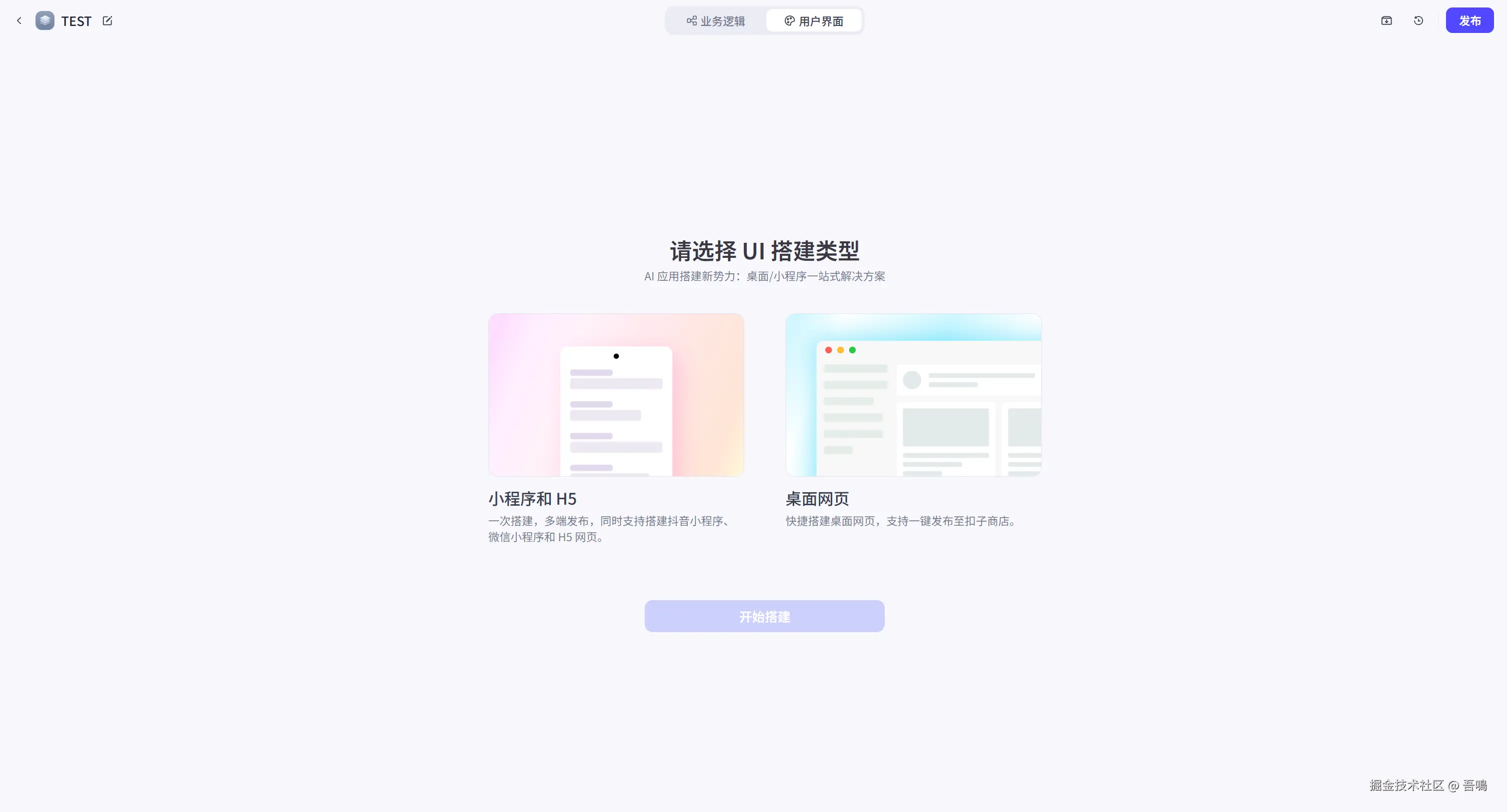 可以看到切换到用户界面之后,有两种UI类型可以选择。小程序和H5的类型主要是移动端的网页,主要适配手机。桌面网页就是PC电脑端的网页,因为吾鳴是在电脑上测试,因此,选择桌面网页,你可以按照你的需要选择。