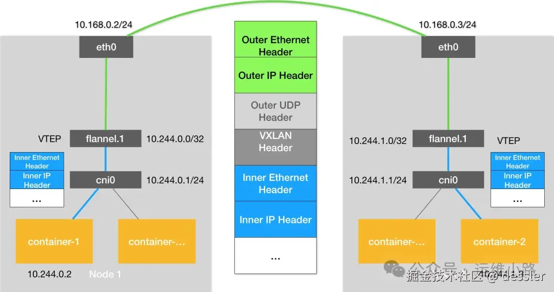5.如果是到其他主机,则到CNI网桥以后,还需要经过Flannel.1的封装,然后到了目的主机以后再经过Flannel.1解封。