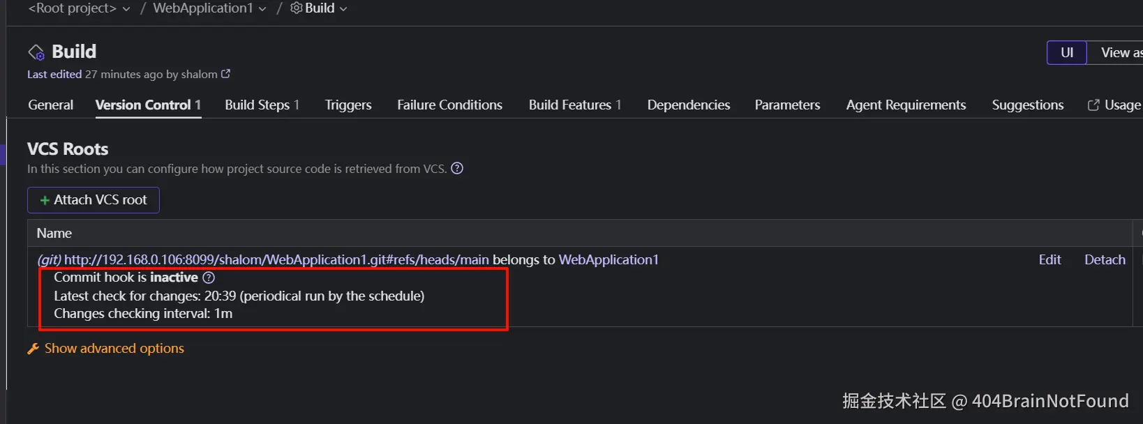 已配置Hooks的项目仍会轮询其远程存储库,作为Hooks停止工作时的备份机制。然而,每次成功的 hook 通信,轮询间隔会自动翻倍。TeamCity 将此间隔增加到的最大值是 4 小时,而最小间隔是 15 分钟。如果定时轮询揭示了没有触发提交钩子的更改,TeamCity 将会将轮询间隔重置为默认值。