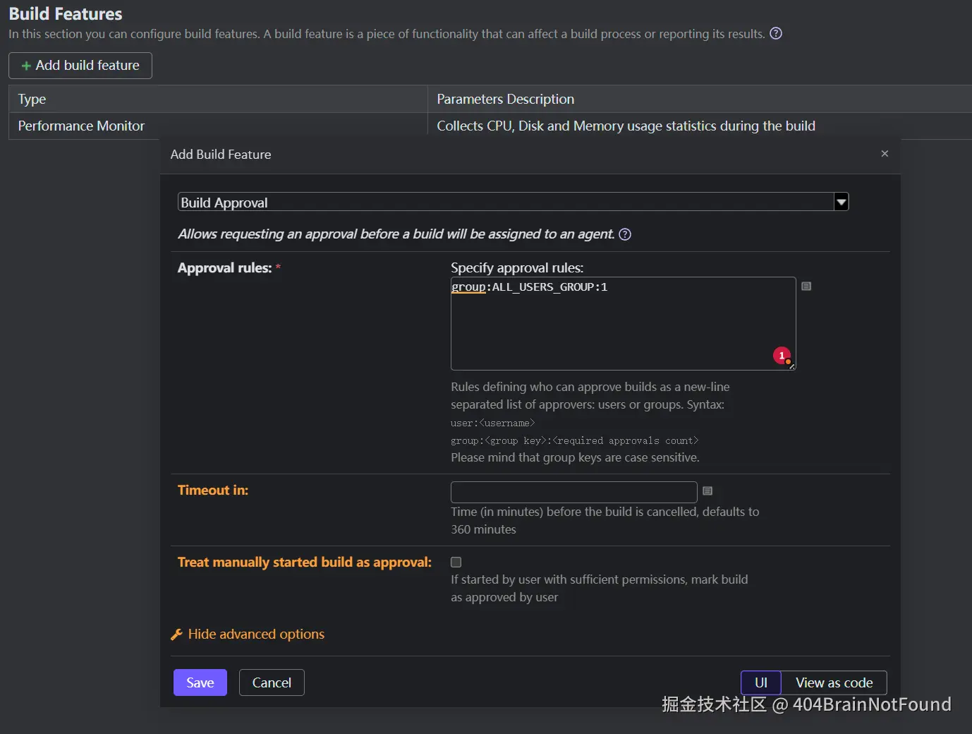 Approval rules:批准规则,可以基于用户或基于用户组,如以下规则只允许在获得 teamlead 用户、 projectadmin 用户以及至少两位 QA 组成员的批准后才开始构建: