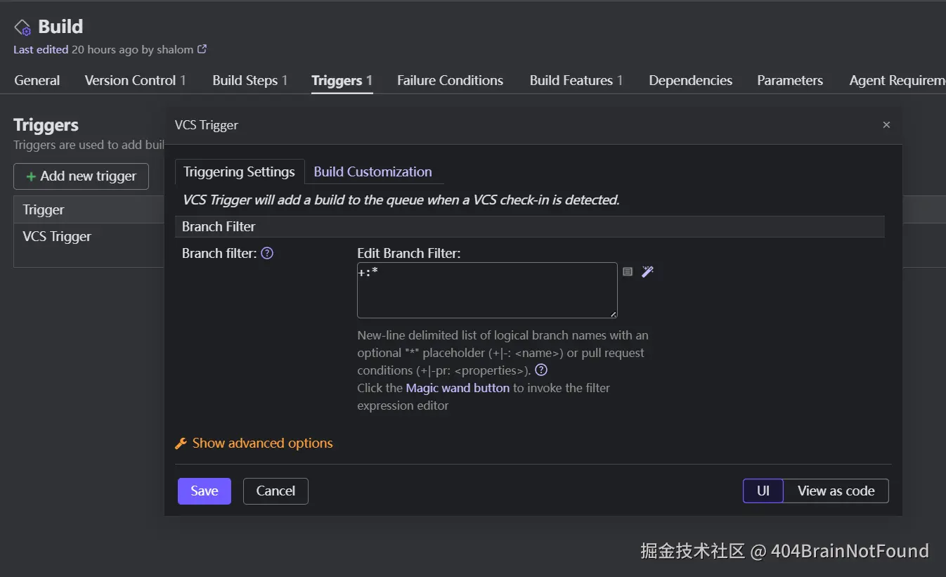 配置触发器VCS trigger,在Triggers页面编辑或新增VCS trigger