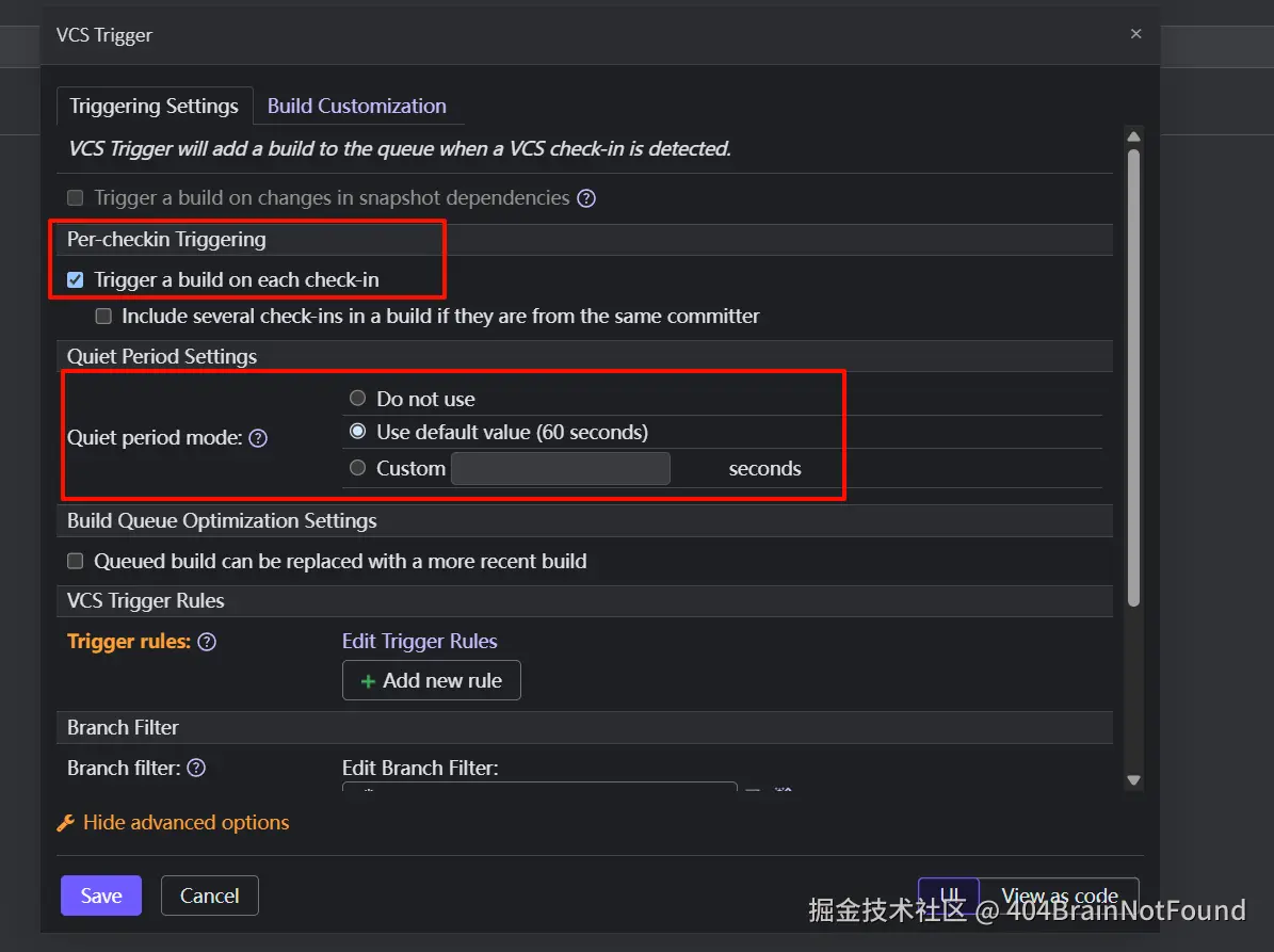 修改VCS Trigger来实现每次check-in的时候触发构建: