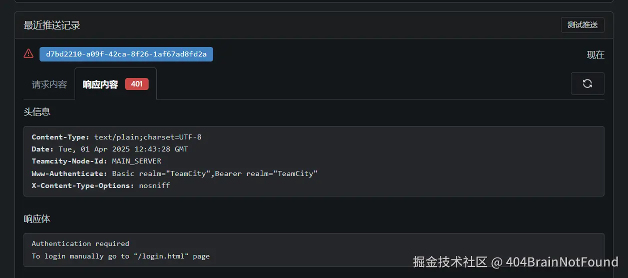 调用失败,这里因为TeamCity的安全策略,TeamCity要求所有 REST API 调用进行身份验证。下面添加TeamCity访问令牌: