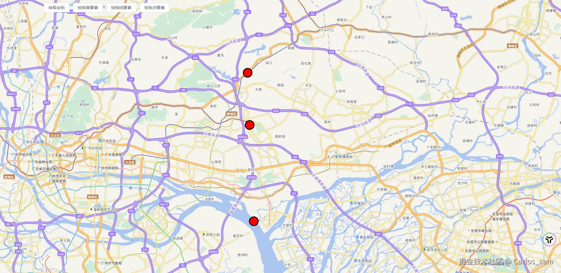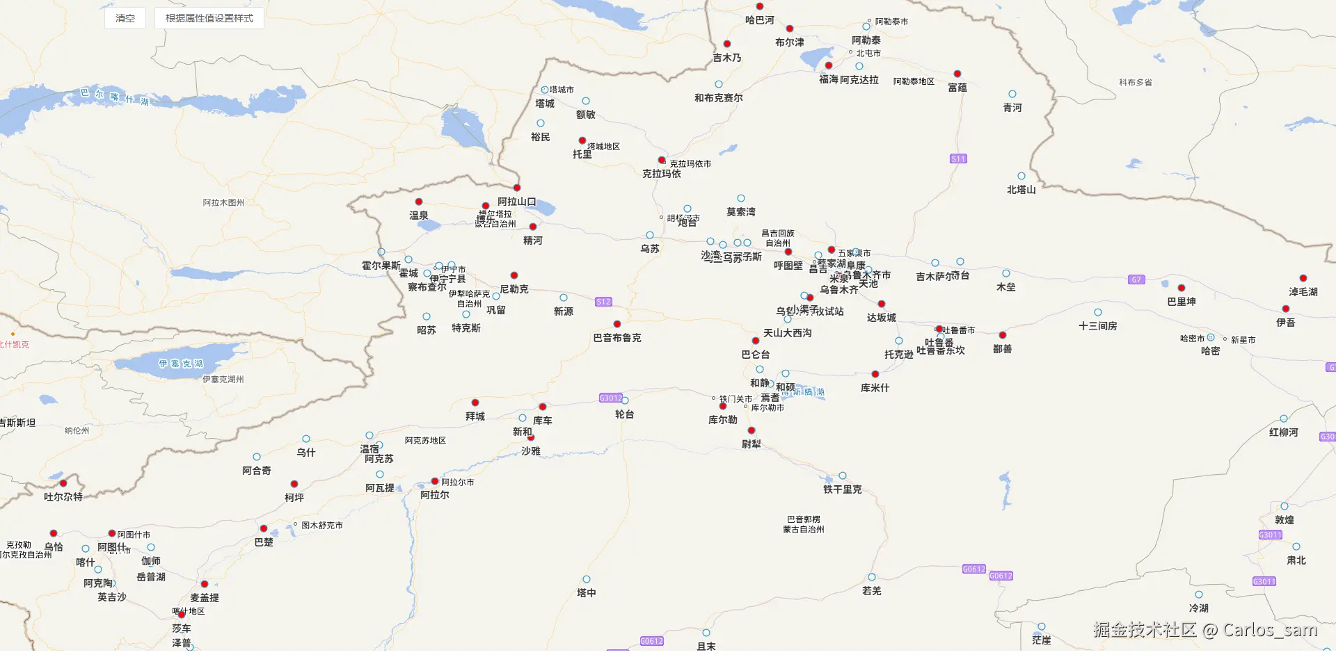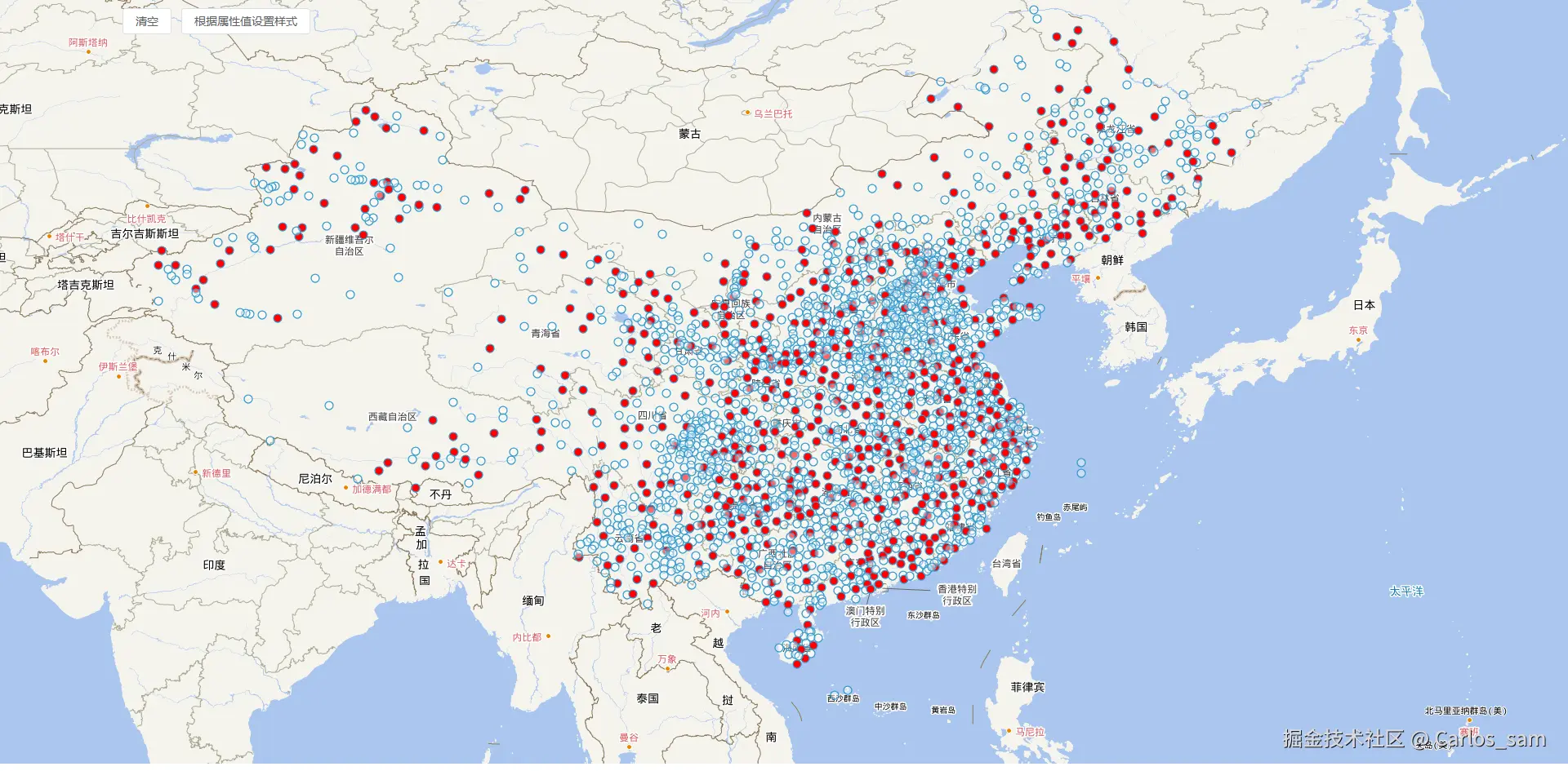 我向地图中添加了一些气象站点,让类型为基本站的站点渲染为红色圆,其它站点则渲染为白色圆。
