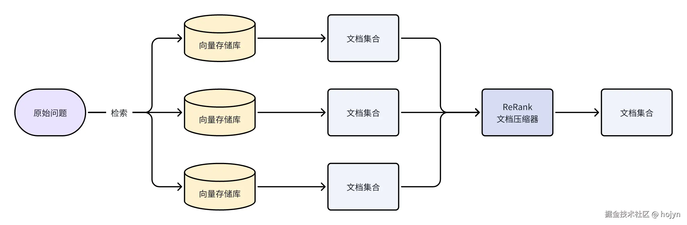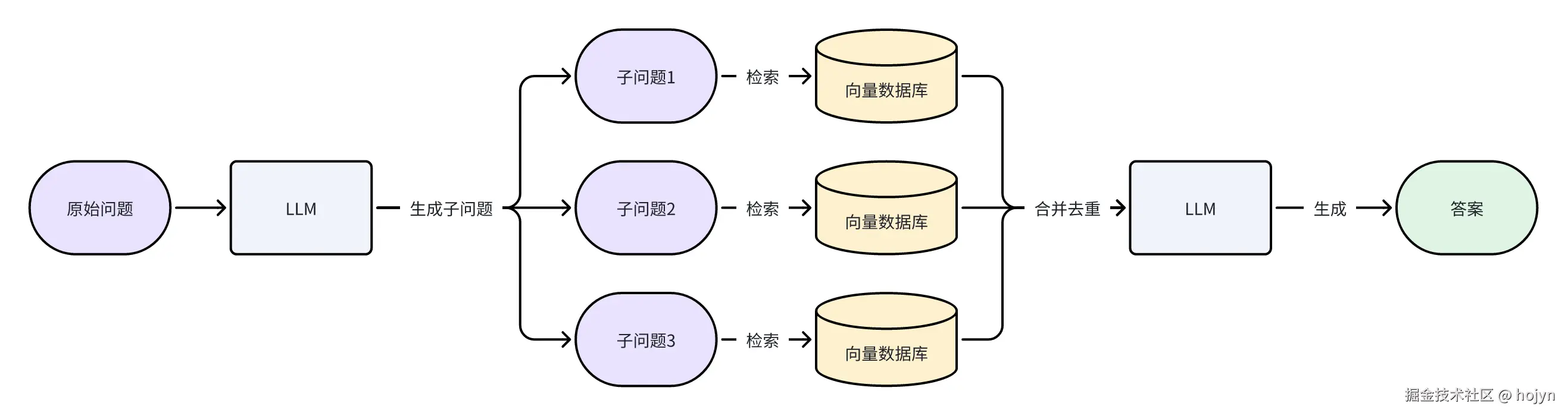 如果直接使用原始问题进行检索,可以因为用户的表述偏差导致检索不到相关的文档。多查询重写策略的核心思想是利用大语言模型(LLM)对原始问题进行扩展、分解或抽象,生成多个语义相关但视角不同的子查询,从而提高检索系统对用户意图的覆盖能力。这种方法能有效解决单一查询可能存在的表述偏差或信息不全问题。整体流程如下所示: