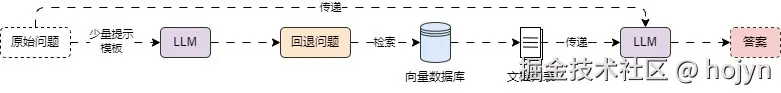 问题回退策略和问题分解策略相反,当用户问题非常具体时,可能无法检索的对应文档,就需要将问题进行抽象。比如“李开复在2000年是在哪个公司工作?”,重新抽象成“李开复的工作经历是什么?”。处理流程如下: