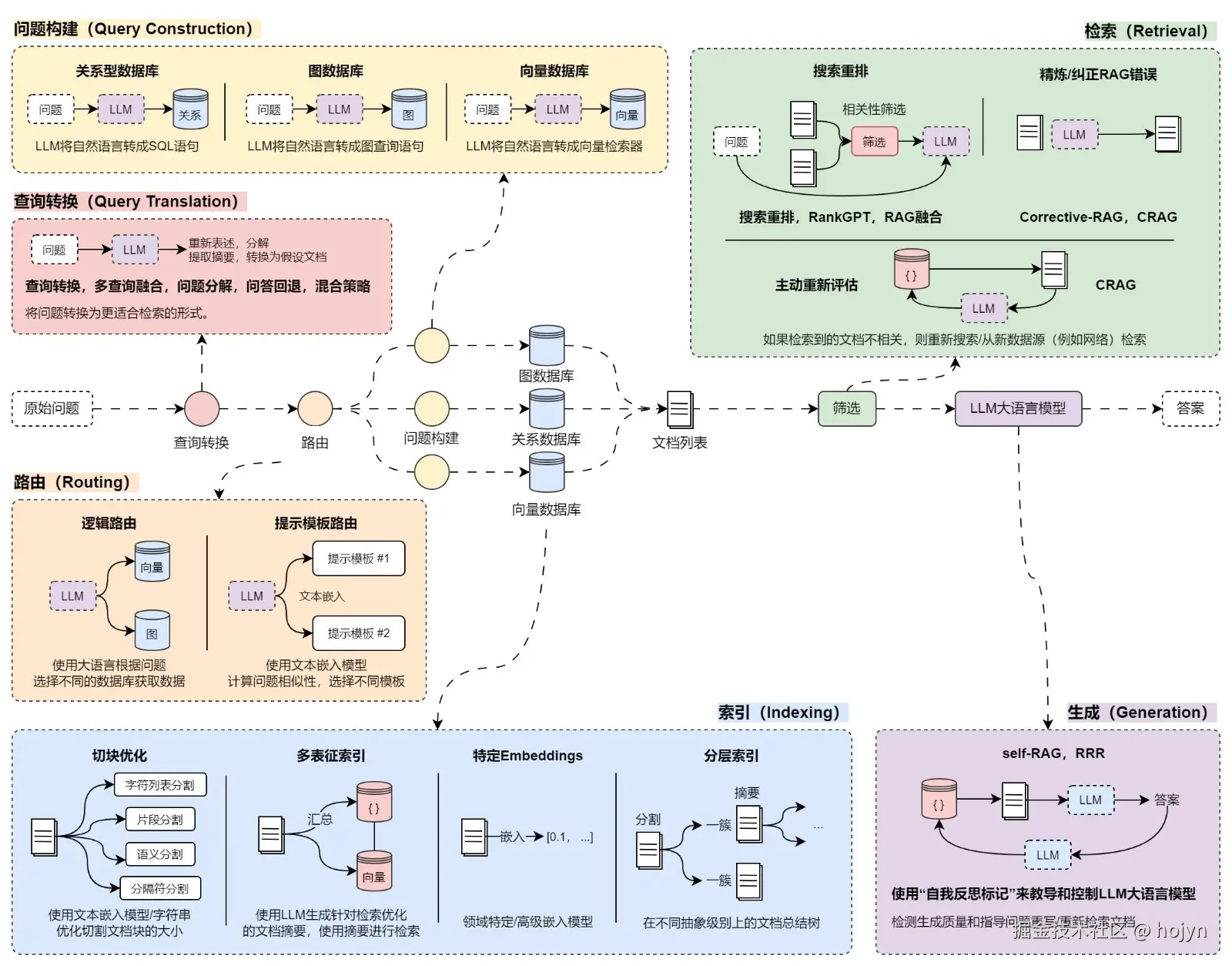 通常RAG的优化策略主要分为:查询转换、路由、问题构建、索引、检索和生成六个方面进行,如下与所示: