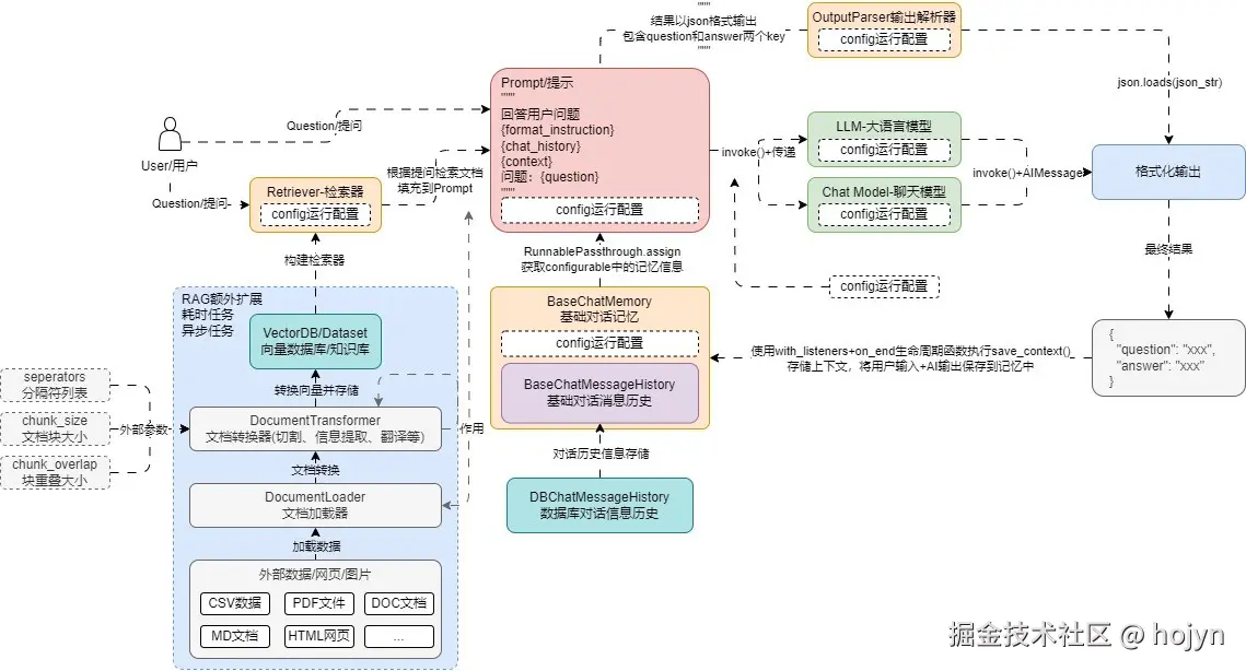一个完整的RAG应用开发流程,涉及到文档加载器、向量数据库、检索器、Prompt、记忆、输出解析器、大语言模型、多个功能模块,如下所示: