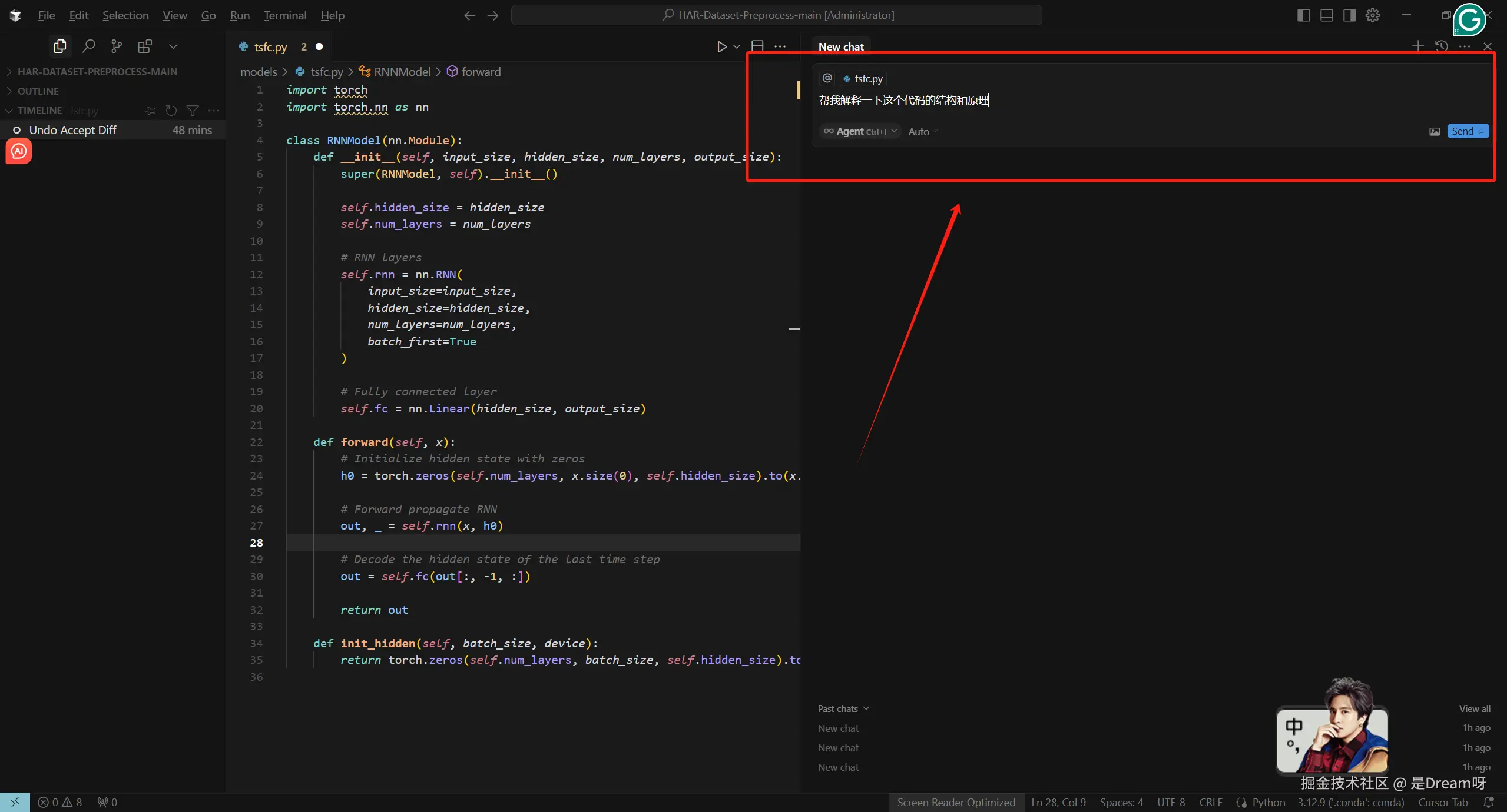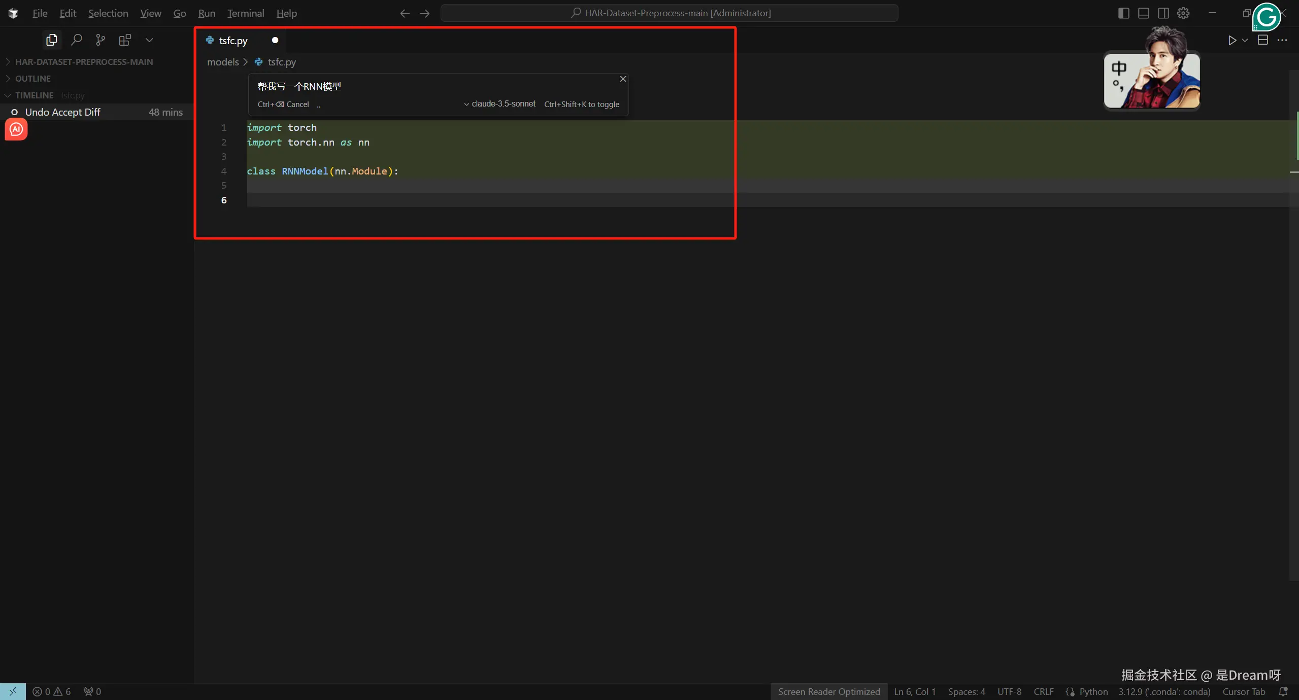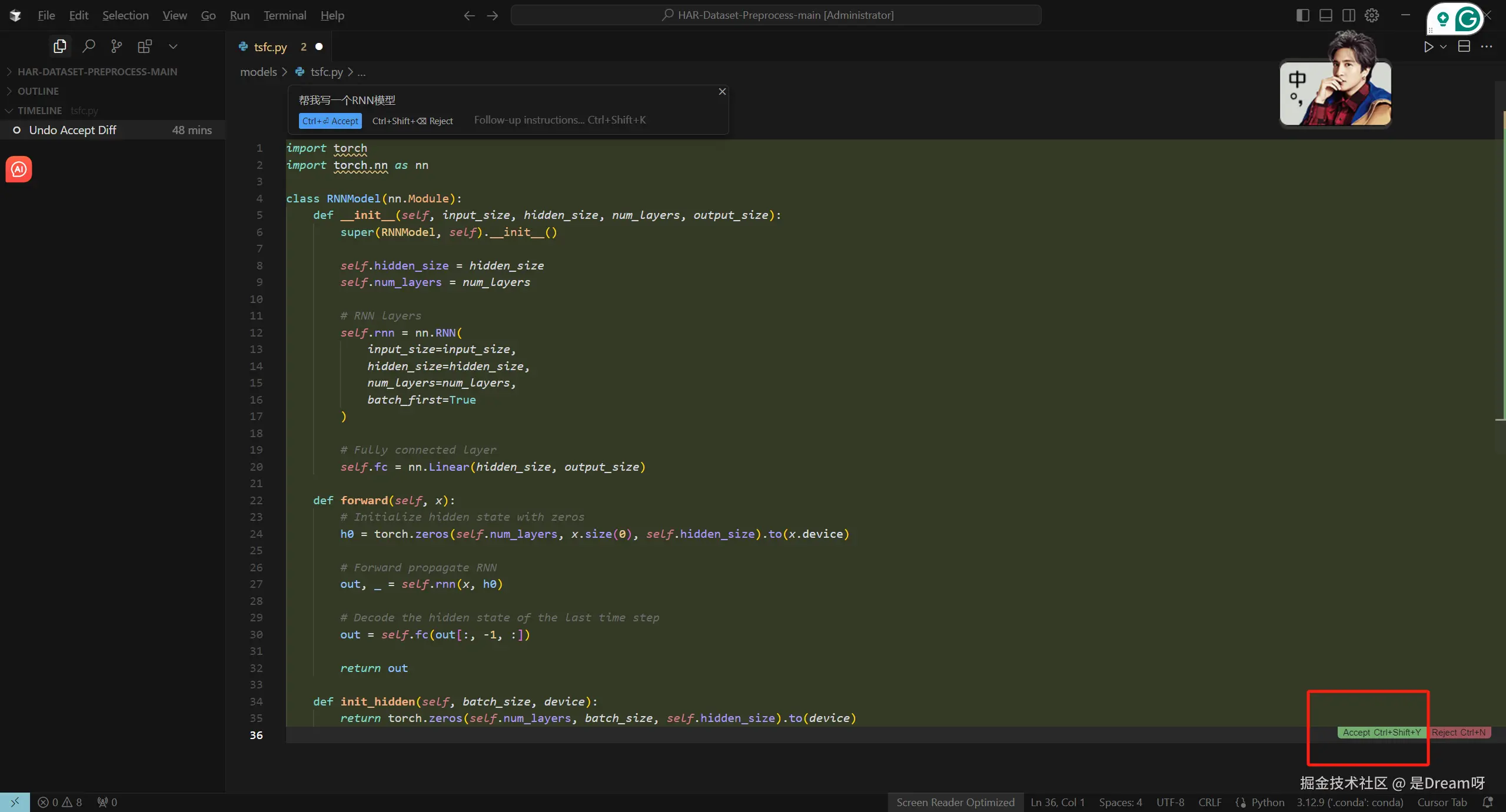 这里我们需要测试RNN模型的效率和准确率,但是我们并没有现成的RNN网络模型代码,我们仅仅需要,按下Ctrl+K, AI助手弹窗便一下子出来了,我们只需要对它说,帮我写一个RNN模型: