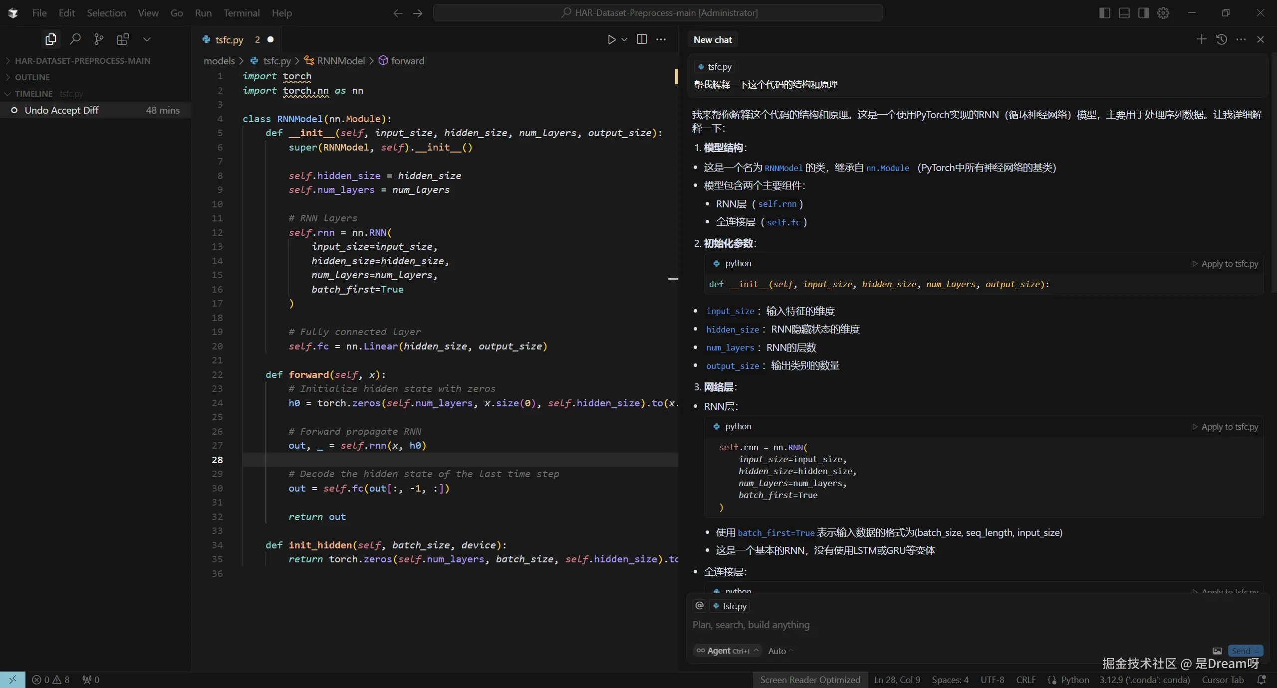 几秒钟的时间,它就将完整的RNN网络模型代码生成出来了,我们仅需要点击右下角的ACCEPT,便可以将代码写入我们的py文件中去。可以说是十分方便快捷!