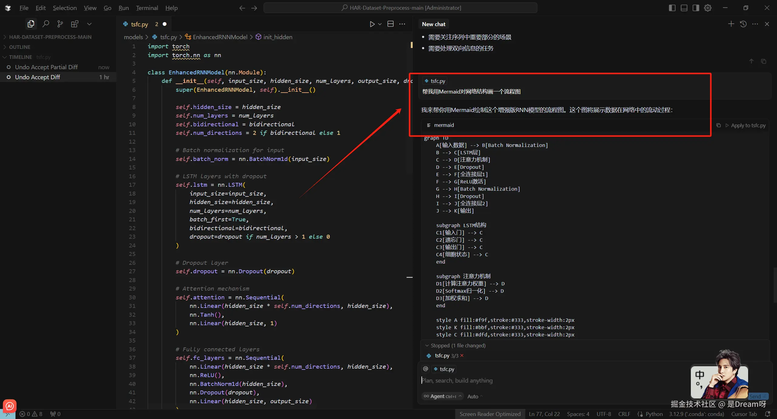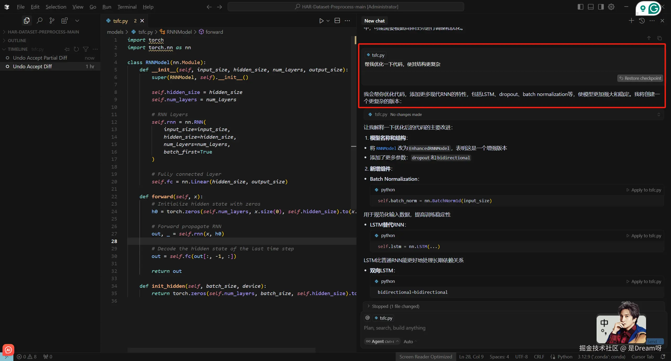 如果我们需要将其进行优化或者补充,直接在此基础上对它说帮我优化一下代码,使其结构更复杂,我们可以看到其给了我们很多建议,比如添加更多现代RNN的特性,包括LSTM、dropout、batch normalization等,使模型更加强大和稳定,直接将其应用便可以自动写入我们的代码中去: