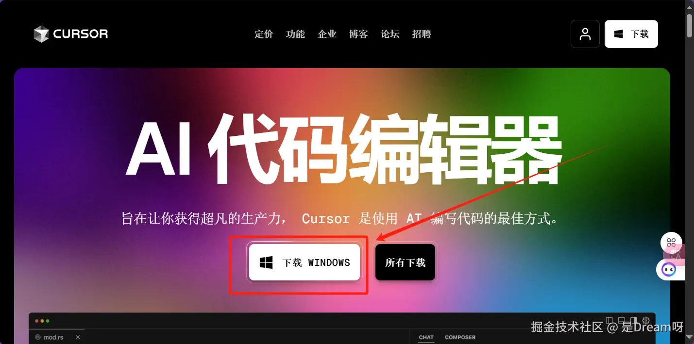 cursor直接在官网下载安装即可,打开官网,点击这个下载按钮即可轻松下载安装: