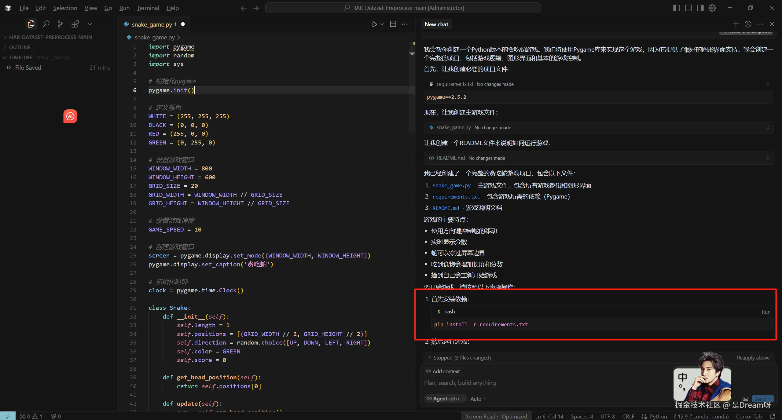 在终端中输入python snake_game.py,便可以运行生成的项目: