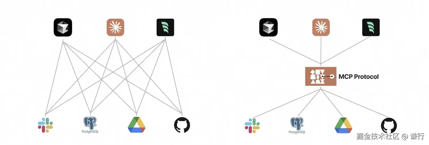 MCP 只是一个协议,并未做任何实现,细究起来上图中用 type-c 拓展坞来类比 MCP 有一定问题,MCP 更像是 Type-C 协议,指导厂家生产兼容 type-c 规范的设备,这样华强北的插头就可以给印度手机充电了,不用为每个品牌手机做插头