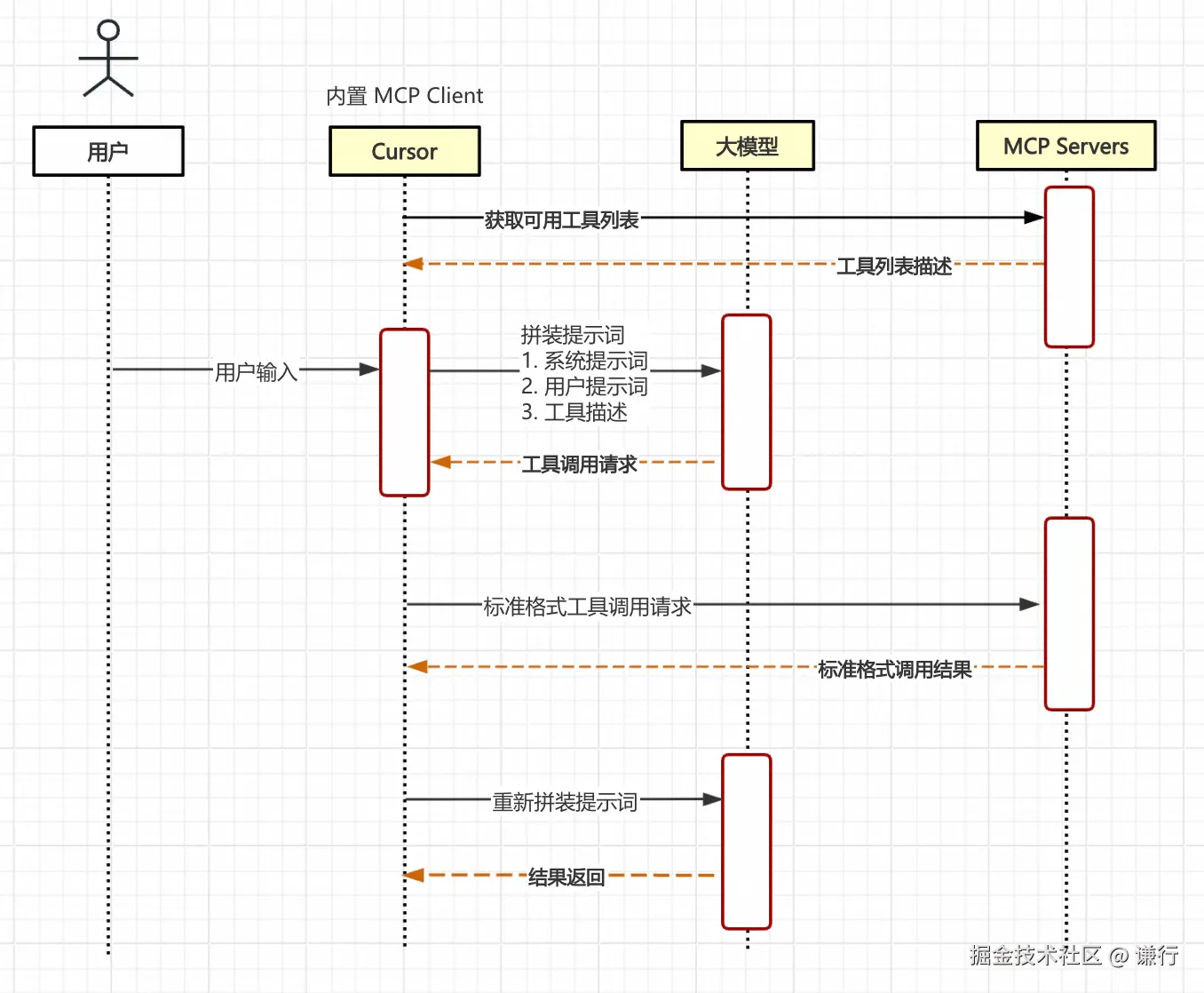 - 模型决策与工具调用:模型解析请求,判断需调用的工具,并生成结构化参数,Cursor 通过 MCP Server 执行工具调用