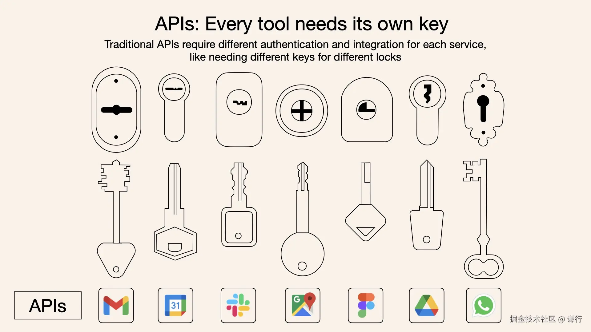 | 传统 API 不同服务提供不同 SDK,调用方需要对该应用做接入 | MCP 不同服务就是一个 MCP Server,都遵循 MCP 协议提供服务 |
