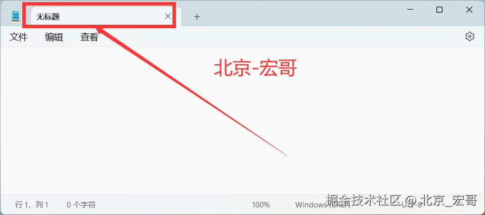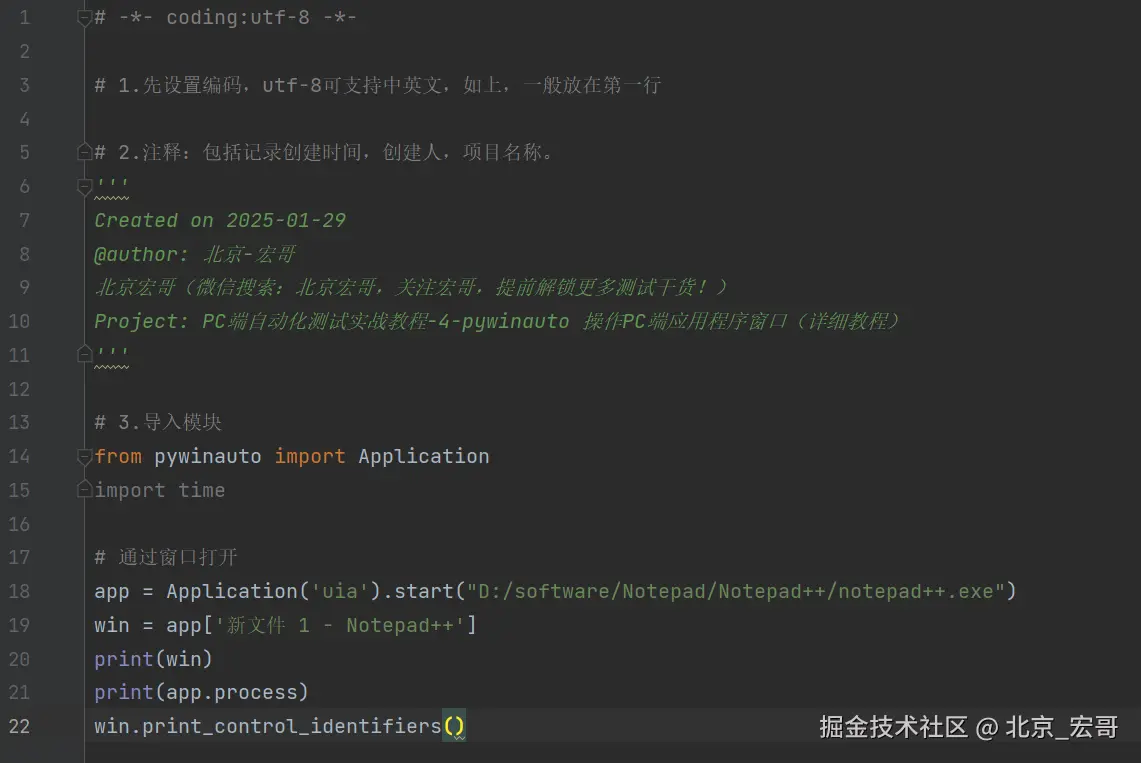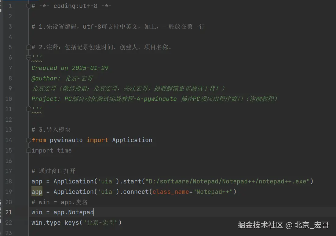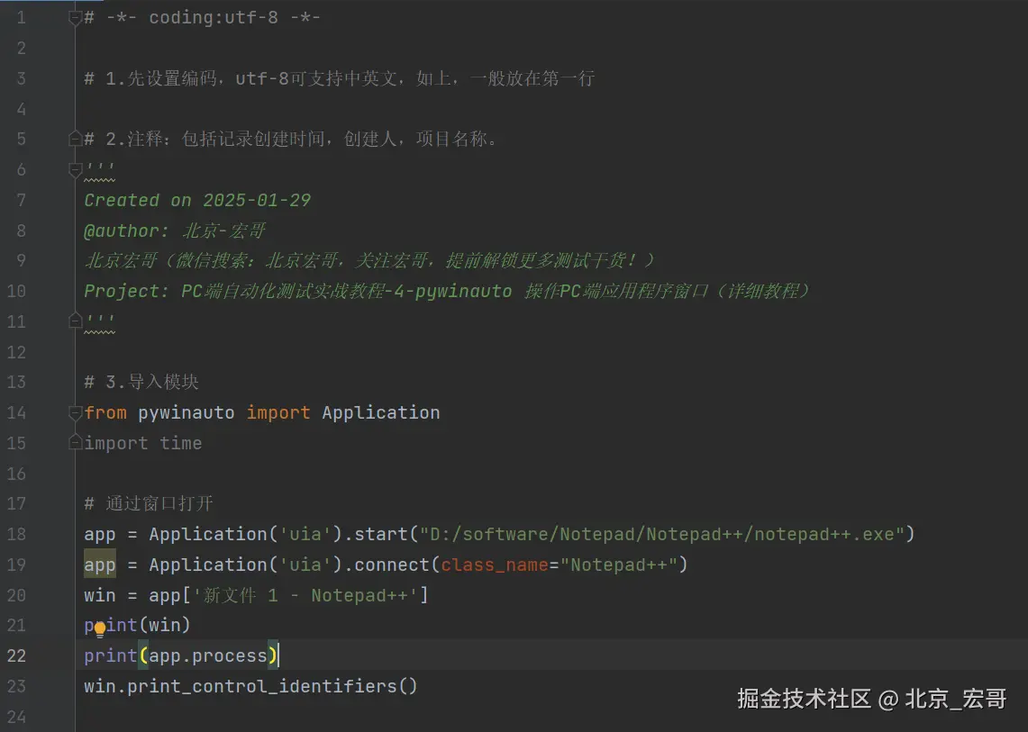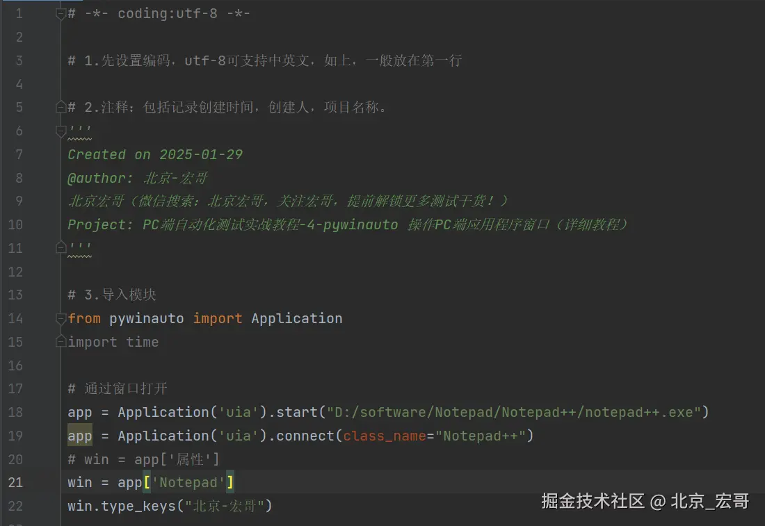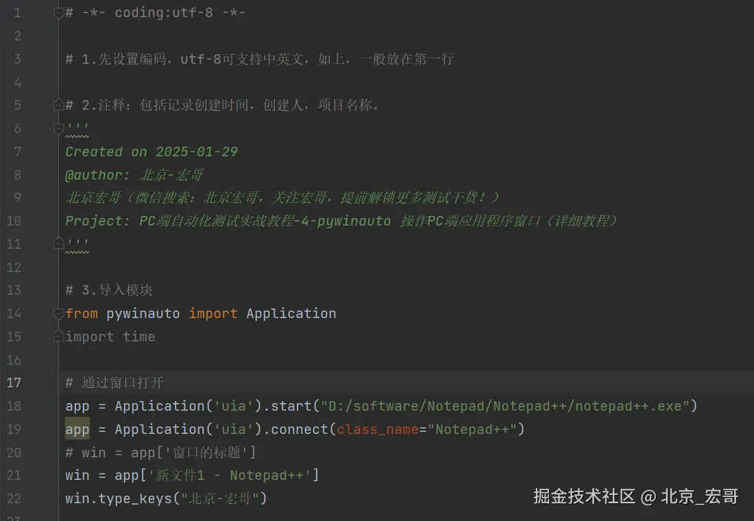 启动PC端的软件后,会出现软件的窗口界面,首先获取到窗口的信息,然后我们需要根据获取到的窗口信息连接到窗口,然后选择我们要测试的窗口,只有选择到要测试的窗口后,我们才能进行操作。如果你都无法选择到要测试窗口,何谈下一步的操作和自动化测试呢?因此接着宏哥介绍几种选择窗口的方法,其实之前的文章中已经或多或少的宏哥已经提及到,因为比较重要,因此宏哥在这里单独将其拎出来介绍和讲解一下。宏哥这里介绍和分享以下三种方法,通过选择notepad++的窗口,然后输入“北京-宏哥”。宏哥在Windows11系统演示,Windows10以下可以参考前边宏哥提到的代码,比Windows11简单多了。