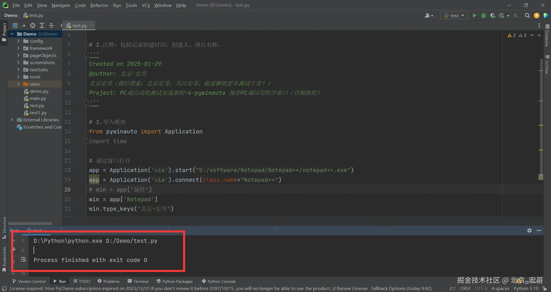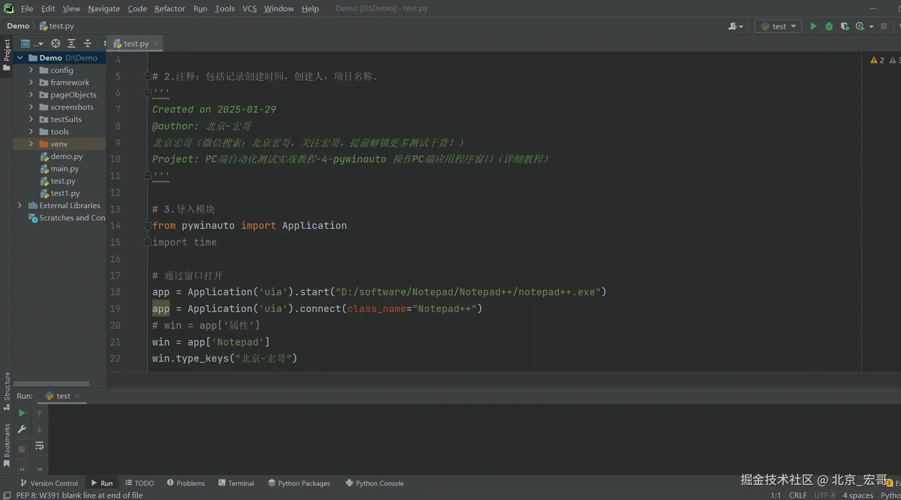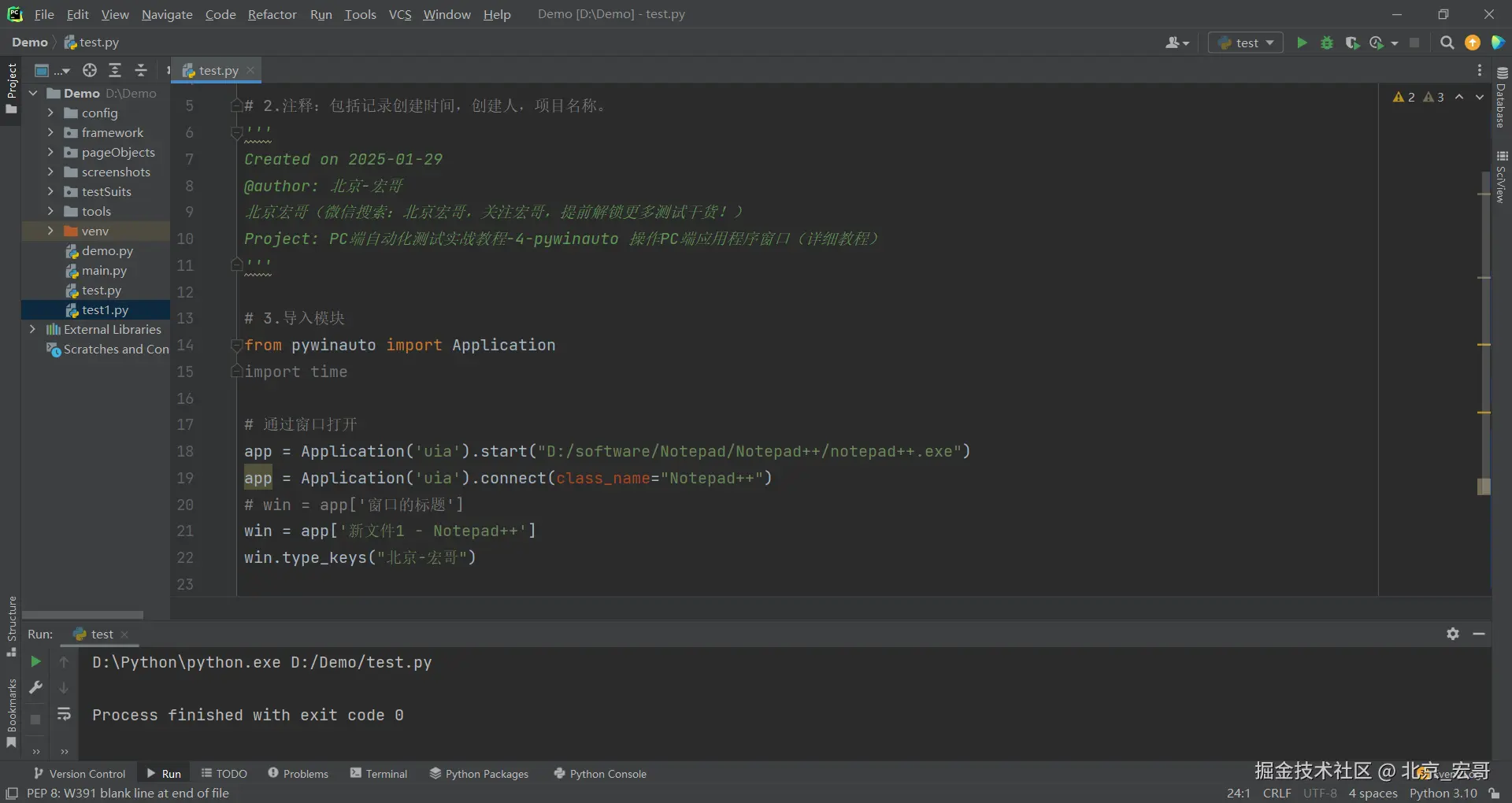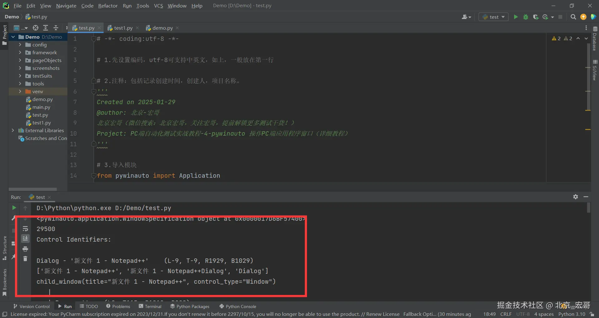 启动PC端的软件后,会出现软件的窗口界面,首先获取到窗口的信息,然后我们需要根据获取到的窗口信息连接到窗口,然后选择我们要测试的窗口,只有选择到要测试的窗口后,我们才能进行操作。如果你都无法选择到要测试窗口,何谈下一步的操作和自动化测试呢?因此接着宏哥介绍几种选择窗口的方法,其实之前的文章中已经或多或少的宏哥已经提及到,因为比较重要,因此宏哥在这里单独将其拎出来介绍和讲解一下。宏哥这里介绍和分享以下三种方法,通过选择notepad++的窗口,然后输入“北京-宏哥”。宏哥在Windows11系统演示,Windows10以下可以参考前边宏哥提到的代码,比Windows11简单多了。