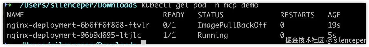 mcp-demo 命名空间下有个nginx 的pod没有running,看下是什么原因并解决