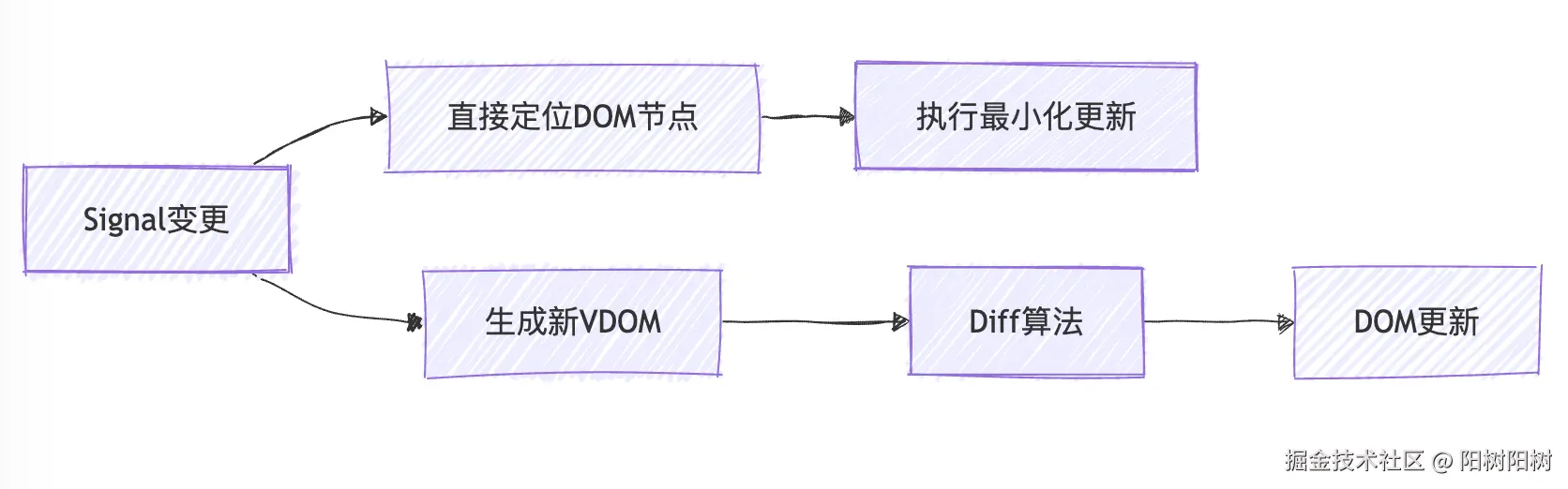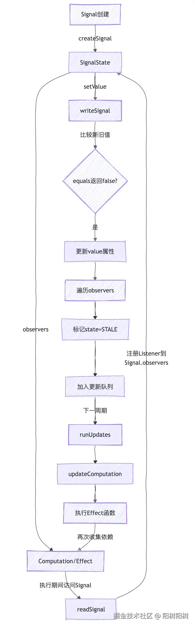 Listener指针建立依赖关系,实现运行时动态追踪。每次执行都会重建依赖,确保精确性。 - 更新标记策略:Signal更新时通过