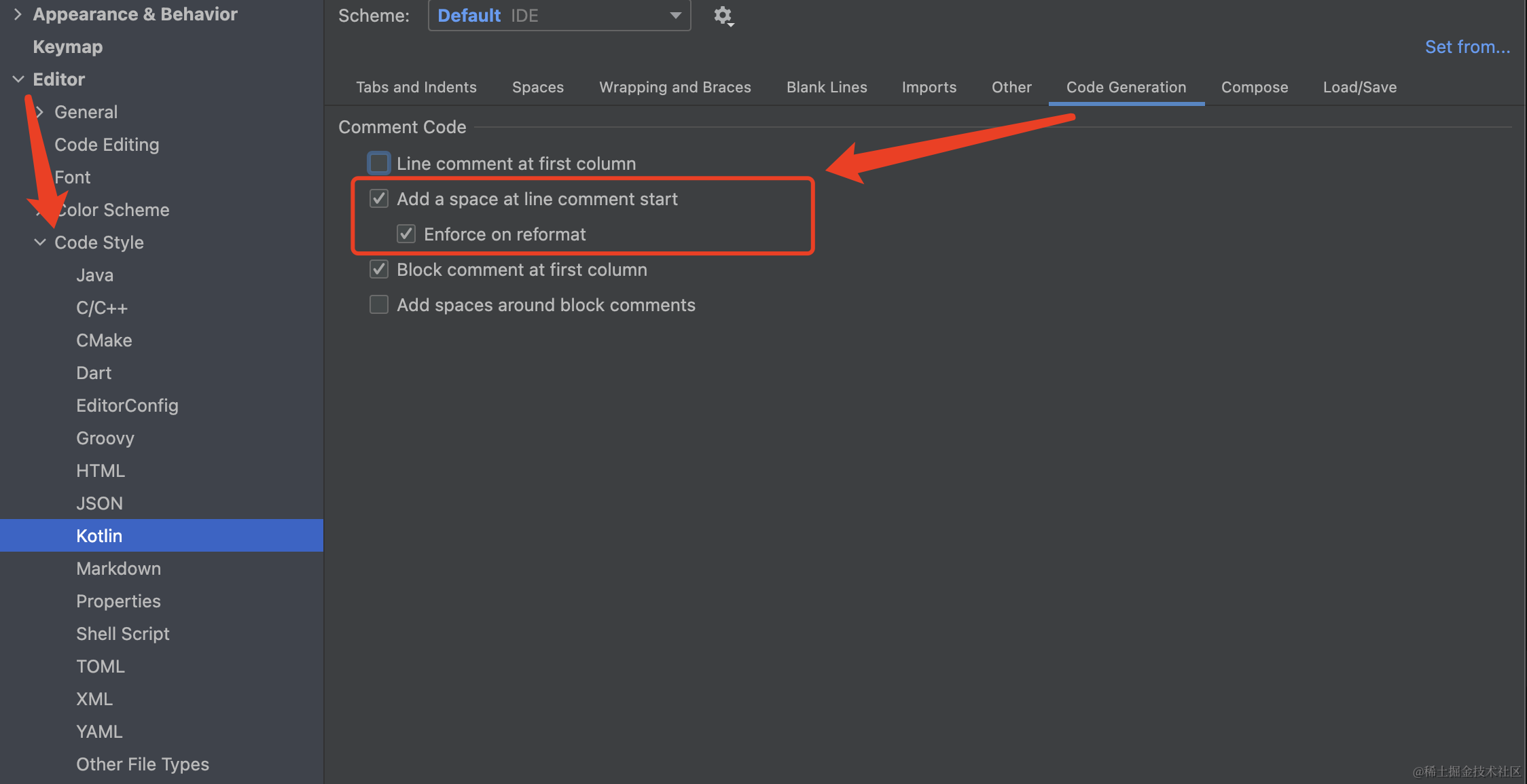修改idea/android studio等编辑器快捷注释从当前行开头的反人类行为 1024小神 2025-04-13 71 阅读1分钟 不知道什么时候开始,idea编辑的快捷注释开始从当前行开头出现了,显得实在是难受,我只想让在当前行代码的部份开始缩进两个字符开始,这样才会显得更舒服。不知道有没有强迫症的猴子和我一样,就像下面的效果: 解决办法 也很简单,idea出的编辑器都可以按照这个方法操作,比如pycharm/idea/glang等等,或者基于idea的也可以,比如android studio都可以。找到设置,然后编辑,然后代码样式,选择下面的样式即可:
