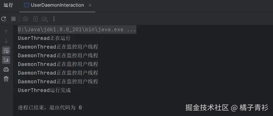 本案例中的守护线程被设计为无限循环以持续监控用户线程,但由于用户线程在5秒后结束,且main线程(作为最后一个用户线程)也随之结束,JVM会检查当前是否仍有守护线程在运行。由于守护线程已被设置为守护状态,因此当所有用户线程结束后,JVM将不再等待守护线程完成其任务,而是直接退出,这一行为直观地展示了守护线程的特性:它们为其他用户线程提供服务,并在所有用户线程结束后自动终止。
