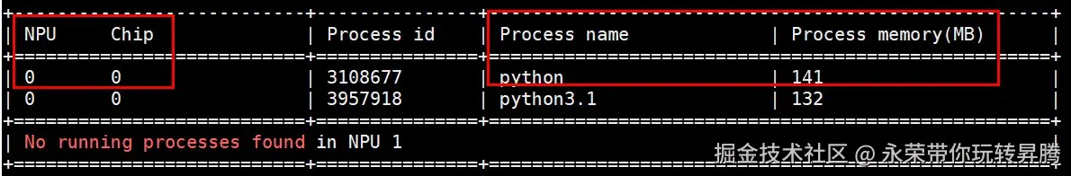 内存使用情况: 整个训练过程的内存使用情况可以通过"npu-smi info"命令在终端查看,因此本文实验只用到了单个npu卡(也就是chip 0),内存占用约141M,对内存、精度或性能优化有兴趣的可以自行尝试进行优化,这里运行过程中也有其他程序在运行,因此本实验用到的网络所需要的内存已单独框出来。