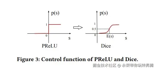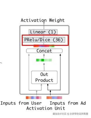 Activation Unit作为Din网络核心模块,通过将用户历史点击过的商品Id(Inputs from User)与候选广告商品的Id(Inputs from Ad)通过Out Product的方式计算相关性。计算相关性后通过concat的方式将原始输入与相关性计算后的输入进行shortcut连接载通过激活与线性层进行输出。关于'PRelu'与'Dice'模块也就是Din网络中引入的自适适应的数据激活函数。