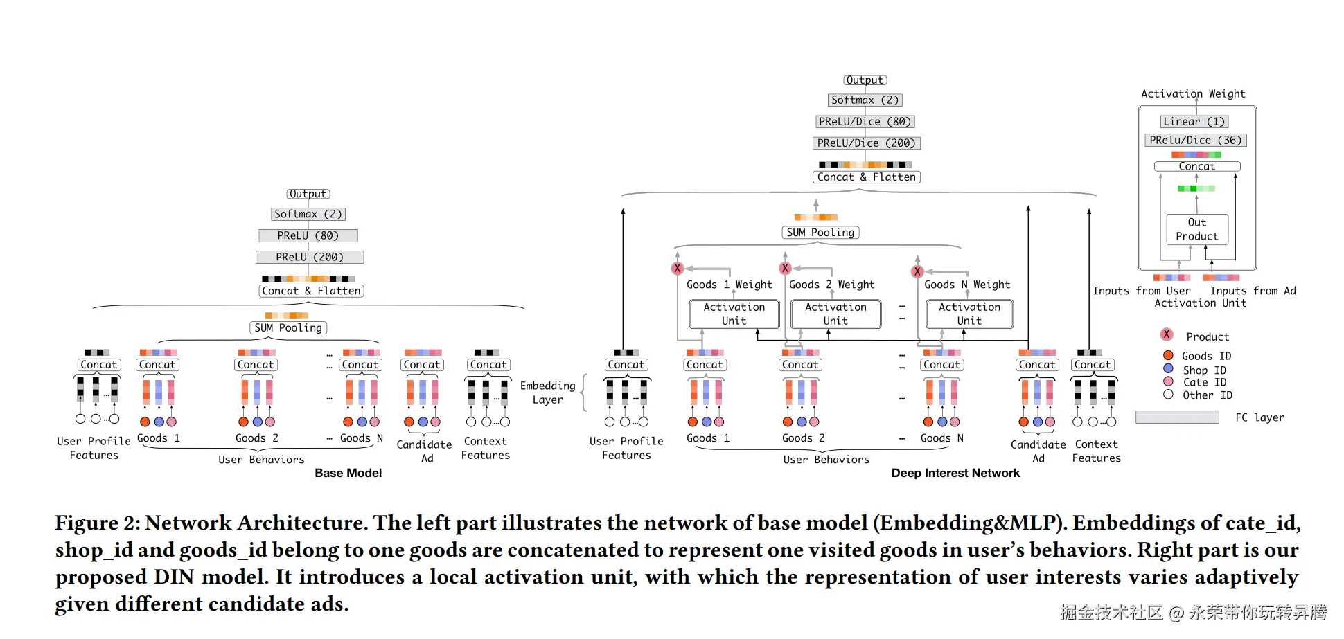 当前广告模型基本上遵循的都是embedding&MLP组合模式(图中basemodel部分),而Din网络通过在embedding层与MLP之间加入Attention机制有效的解决了推荐广告与用户历史购买行为之间相关性的问题,其网络架构重点由两部分组成,一个是激活模块(图中的Activation Unit),另一个是Attention模块(图中的Sumpooling),接下来将分别介绍这两部分的原理及如何使用pytorch搭建这两部分从而构建整个Din网络。
