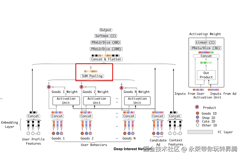 从图中可以看出在做多值特征pooling的时候并不会考虑每个item的重要性,但是在实际的应用过程中我们知道一个爱游泳的人,之前购买书籍、冰淇淋、薯片、游泳镜。给他推荐护目镜后他是否会点击这次推荐广告,跟之前购买的书籍、薯片与冰淇淋无关,而是跟他以前购买的游泳帽相关。也就是在这一次CTR预估中,部分历史数据(游泳镜)起到了决定作用,而其他的基本都无用,所以最好的方式就是给每个item一个权重。