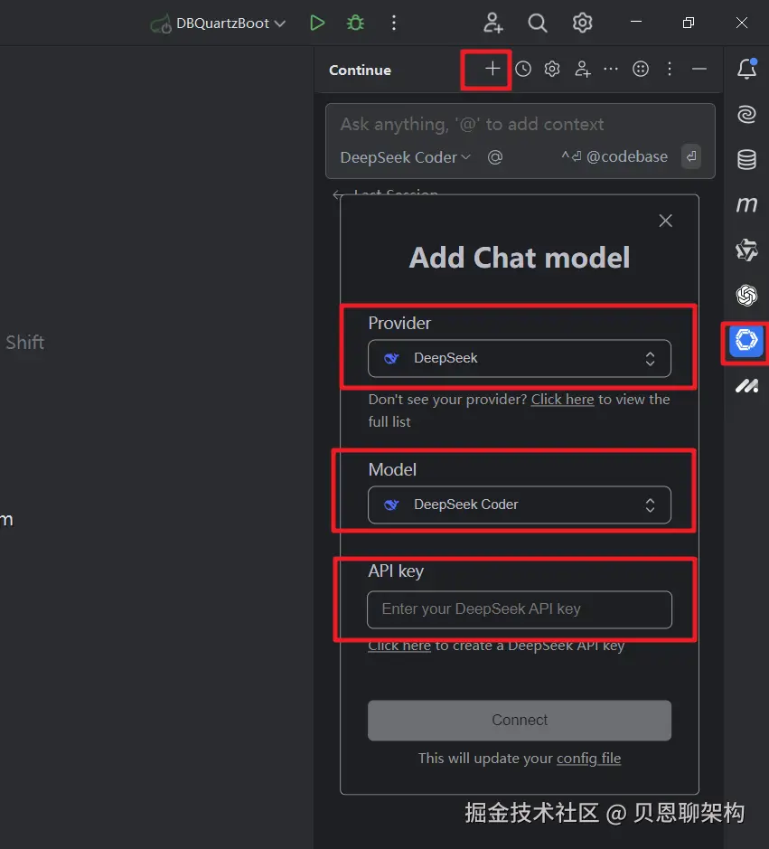 在下图中我们在Provider中选择DeepSeek,Model中选择DeepSeek Coder,最后输入我们在平台申请的API key