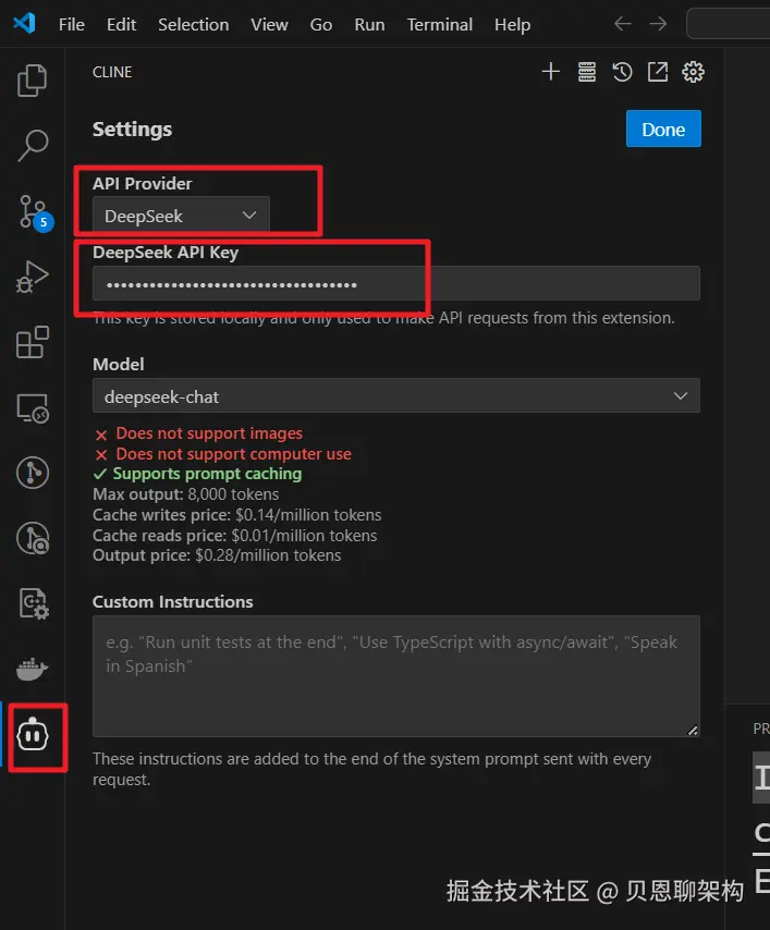 按照下图选择Cline图标,然后再选择DeepSeek大模型,最后再输入在平台申请的密钥(API Key)