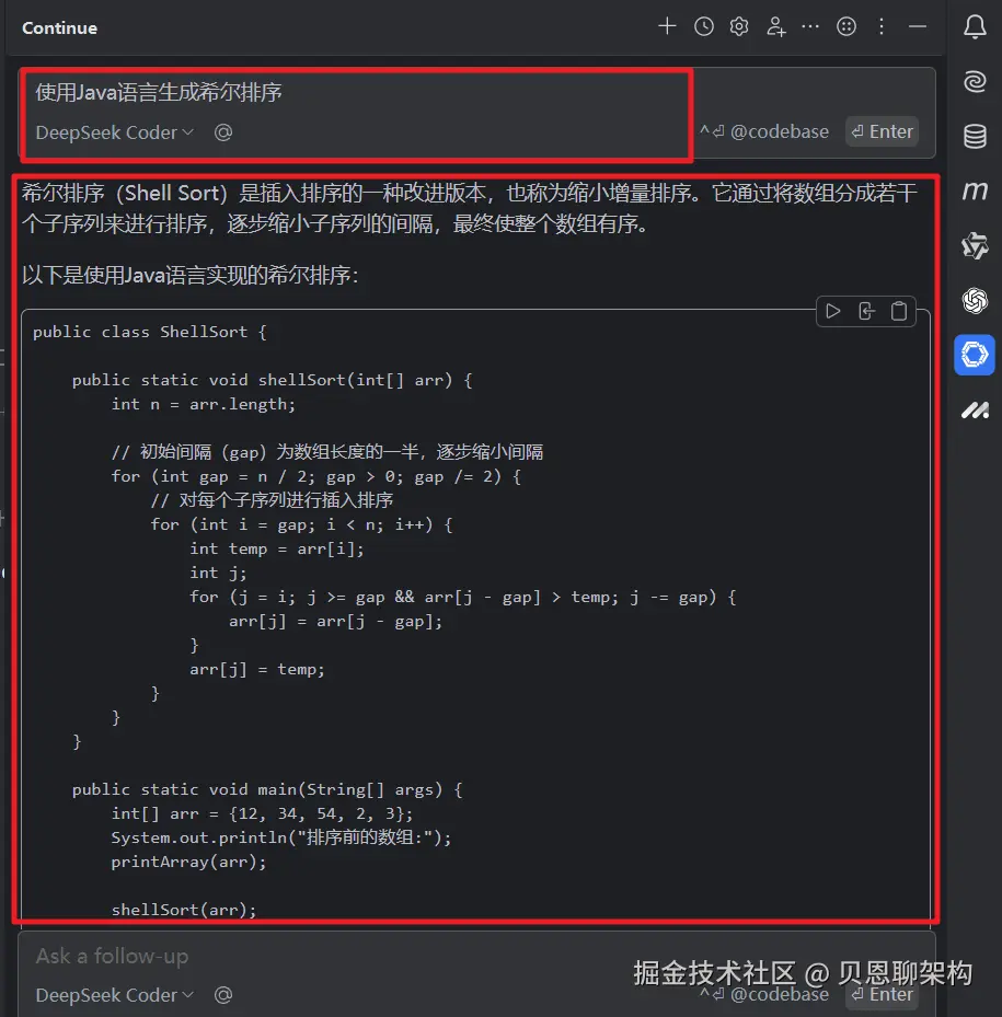 我们可以按照我们的要求,让DeepSeek协助我们进行工作,下图是我让DeepSeek帮我使用指定的编程语言生成希尔排序算法给到我的反馈