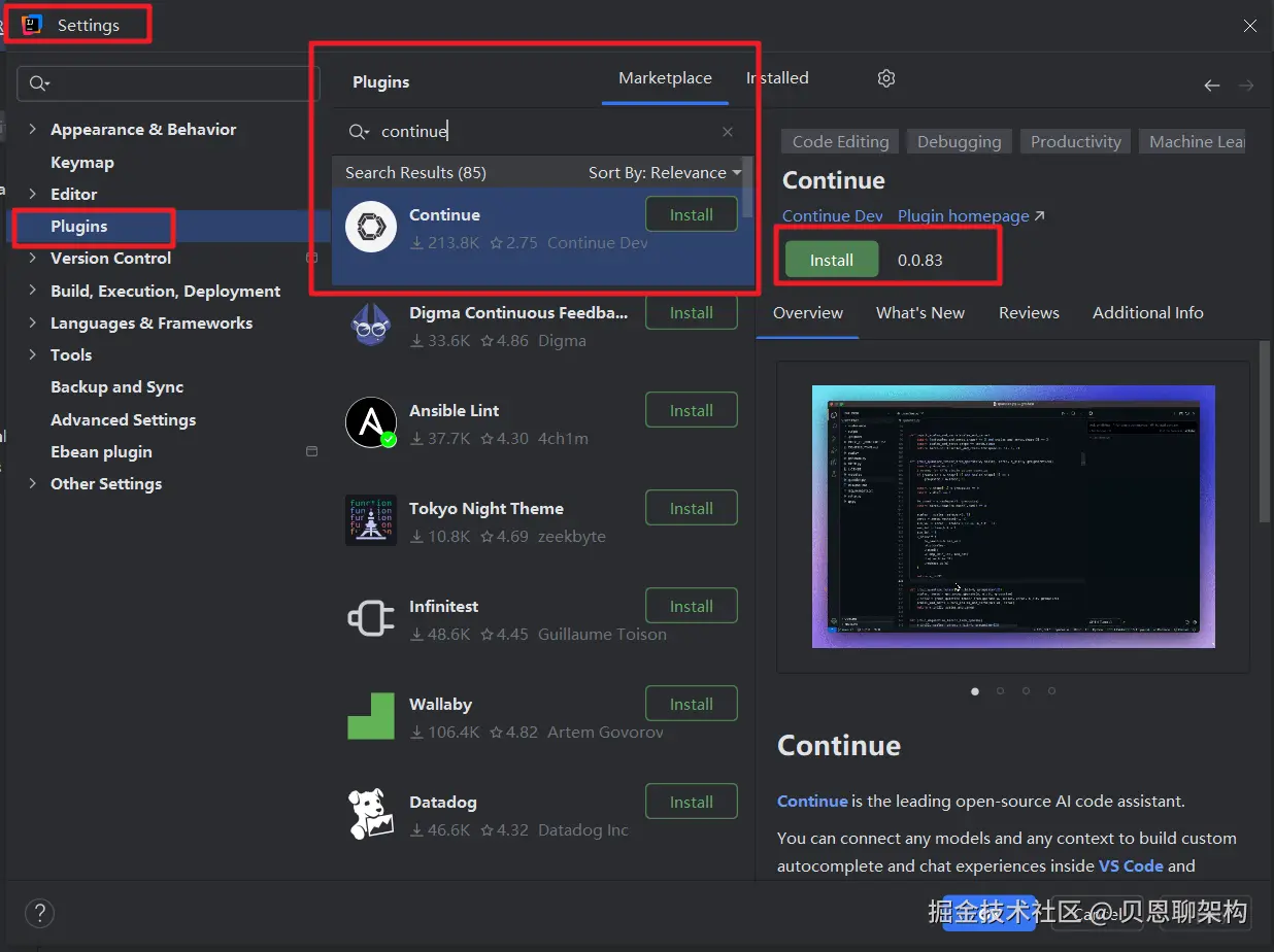 本篇用Continue进行安装,然后再和DeepSeek集成,按照下图进行安装和设置