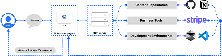 它提供了一种标准方式来连接内容存储库(GitHub、Notion)、开发环境、Web 和 业务工具 到辅助 AI 技术。MCP 的一个流行的且不断增长的用例是 AI 辅助编码。数百个与开发环境和工具(如 Cursor 和 Windsurf)的 MCP 集成允许开发人员连接外部应用程序并与之交互以进行开发。