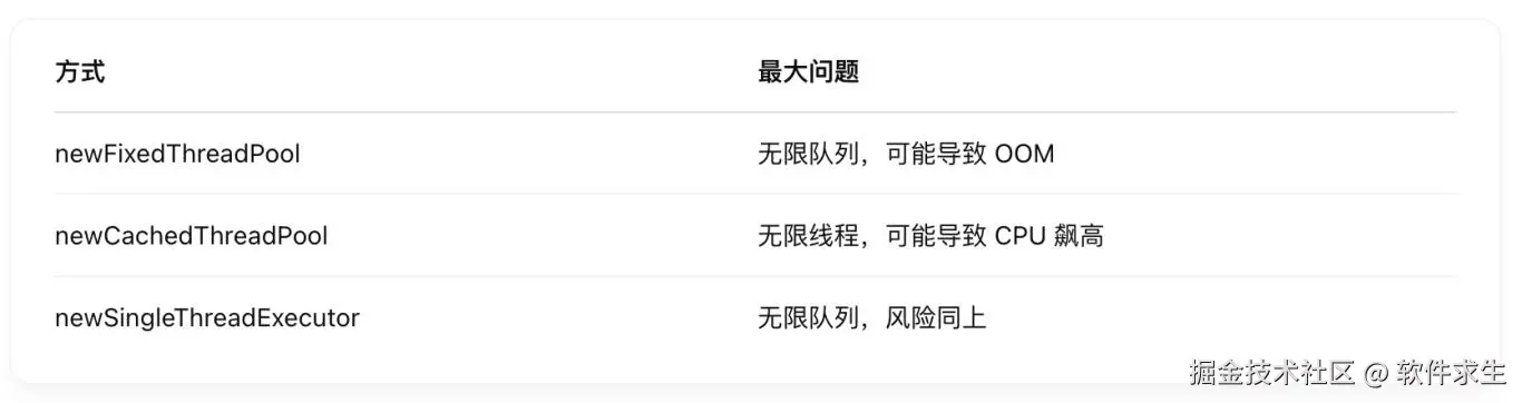 现在你可能会问,Executors 不是封装好的吗?为啥还说它是“坑”?