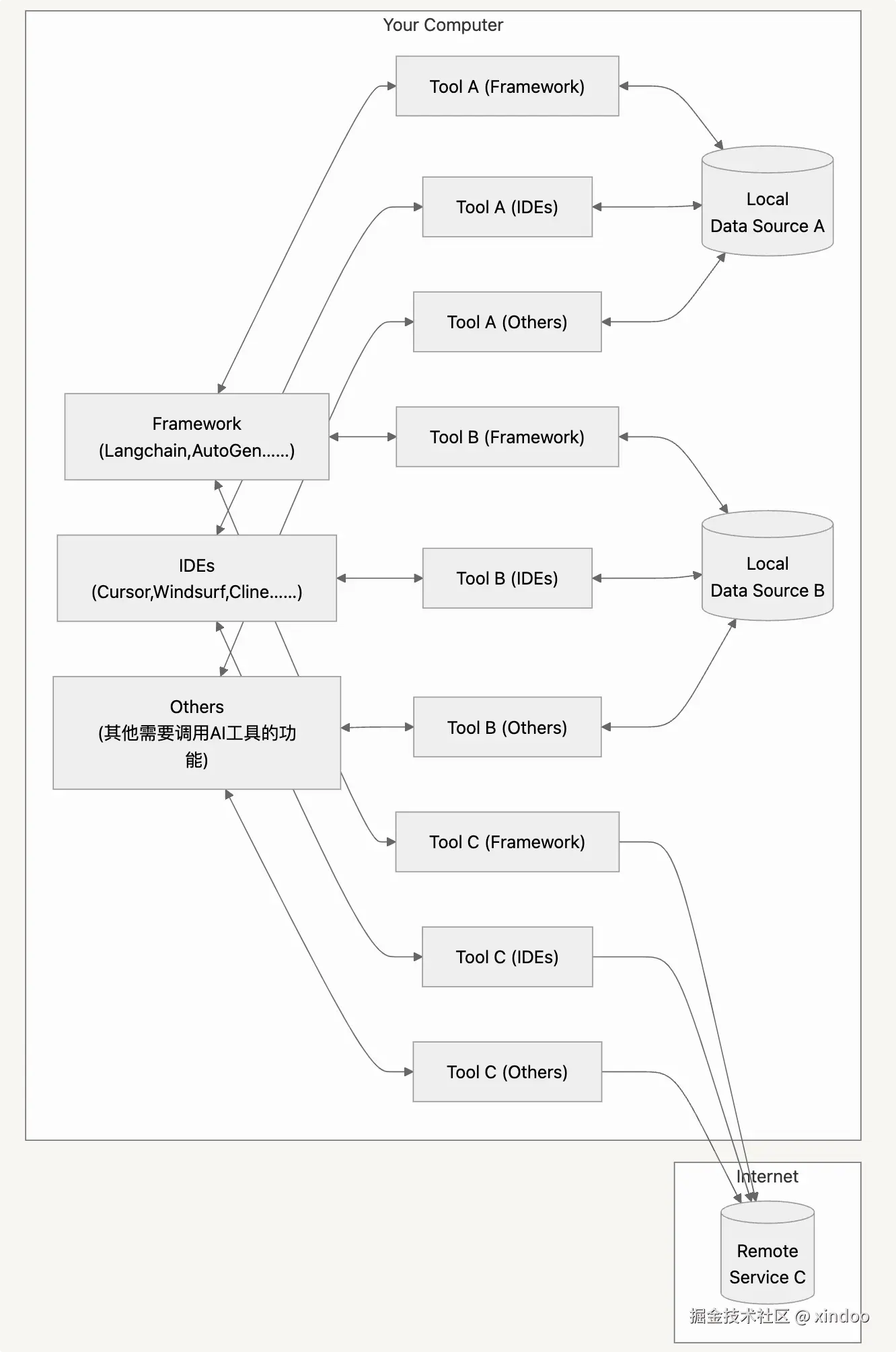 可以看出,工具调用者和工具之间形成了多对多的关系。即使是调用同一个工具,每个框架都需要独立保存一份工具代码,或者是重新接入一次这个工具。不管是哪种方式,重复建设导致的成本都会很高,而且后续从工具的维护成本上,也会带来很大的问题。每当工具需要更新时,所有使用该工具的框架都需要同步更新其工具代码,这无疑增加了维护的复杂度。