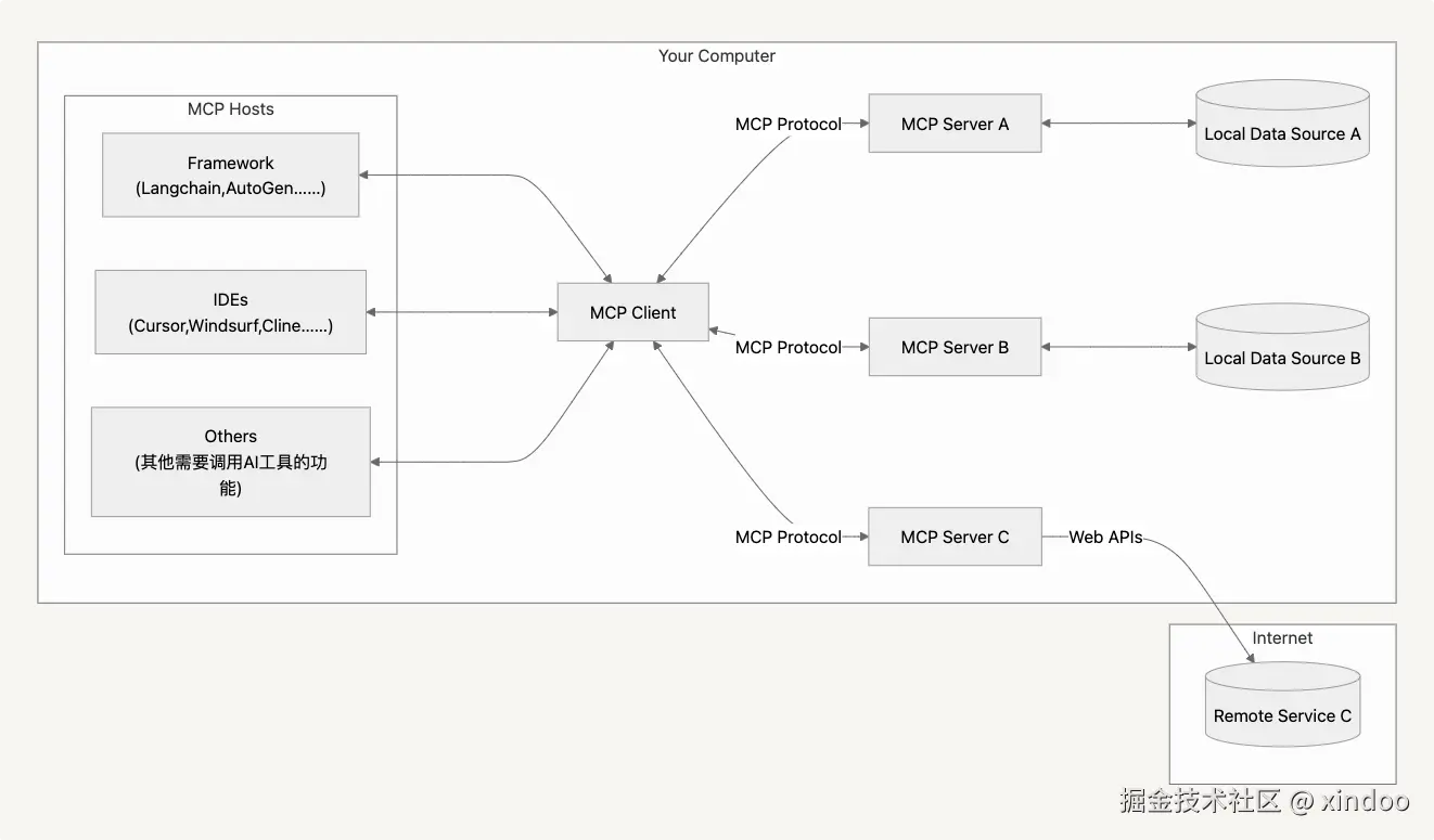 需要重点关注的是,MCP采用的是CS架构。任何软件或框架如果要通过MCP协议调用工具,都必须集成MCP Client,并通过它来调用对应工具的MCP Server。值得注意的是,每个MCP Server实际上都是运行在本地的轻量级程序,它可以是pyhton和可以是nodejs甚至java进程,它可以接受来自各个地方的调用,并且可以安全地访问本地的文件系统和数据库,这些MCP Server因为遵循着同一套实现标准,所以也能在任何支持MCP协议的软件中使用。