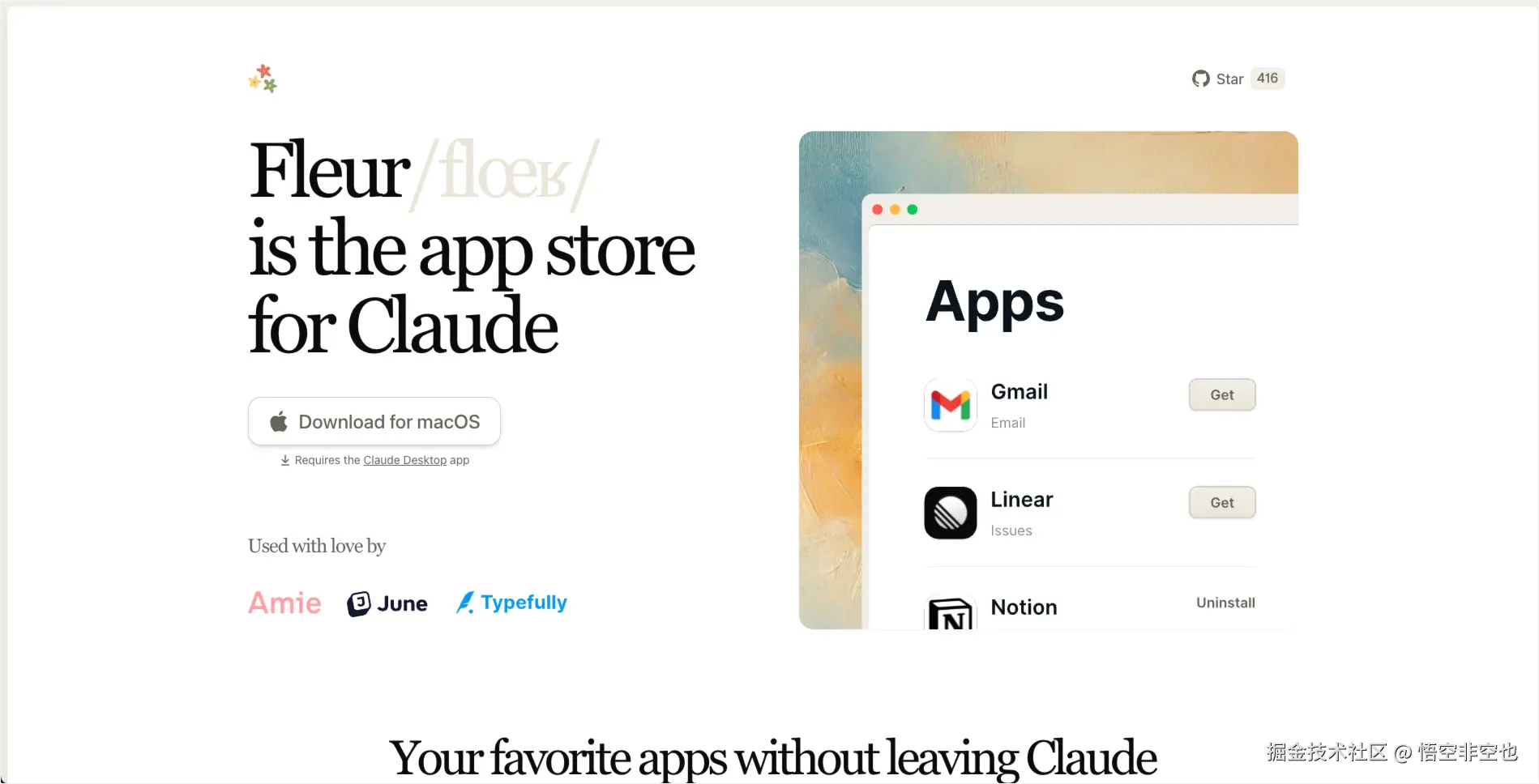 Fleur 是一款专为 macOS 和 Windows 设计的桌面应用程序,旨在为 Anthropic 的 Claude 桌面客户端提供插件扩展功能。它被称为 Claude 的“应用商店”,允许用户通过 Model Context Protocol(MCP)协议将 Claude 与各种常用工具集成,如 Linear、Stripe、Notion、Discord、Slack、Gmail、GitHub、Intercom 等,从而提升 Claude 的实用性和自动化能力