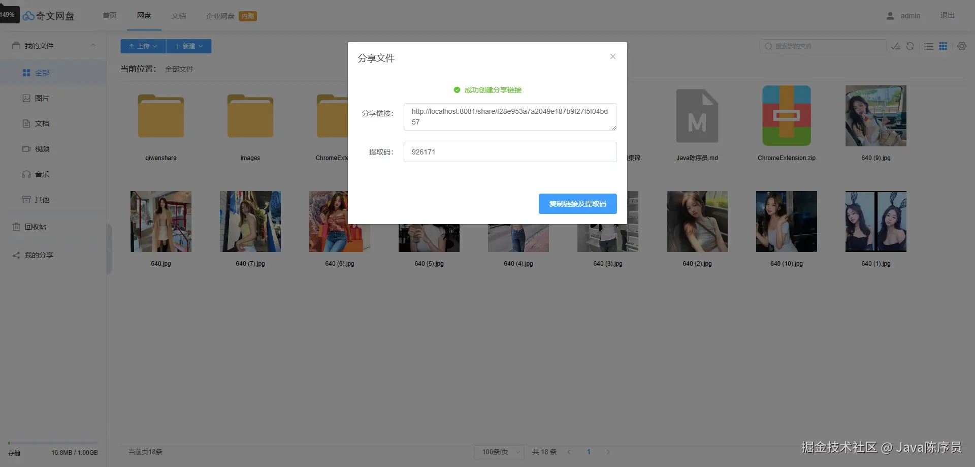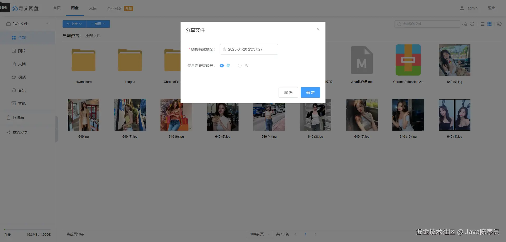 - 文件分享:支持文件分享,可设置过期时间,自动生成提取码,并可查看个人分享过的文件列表