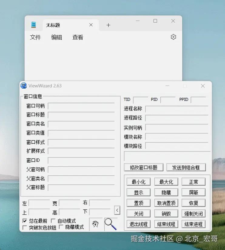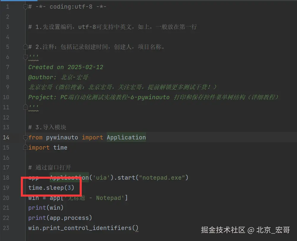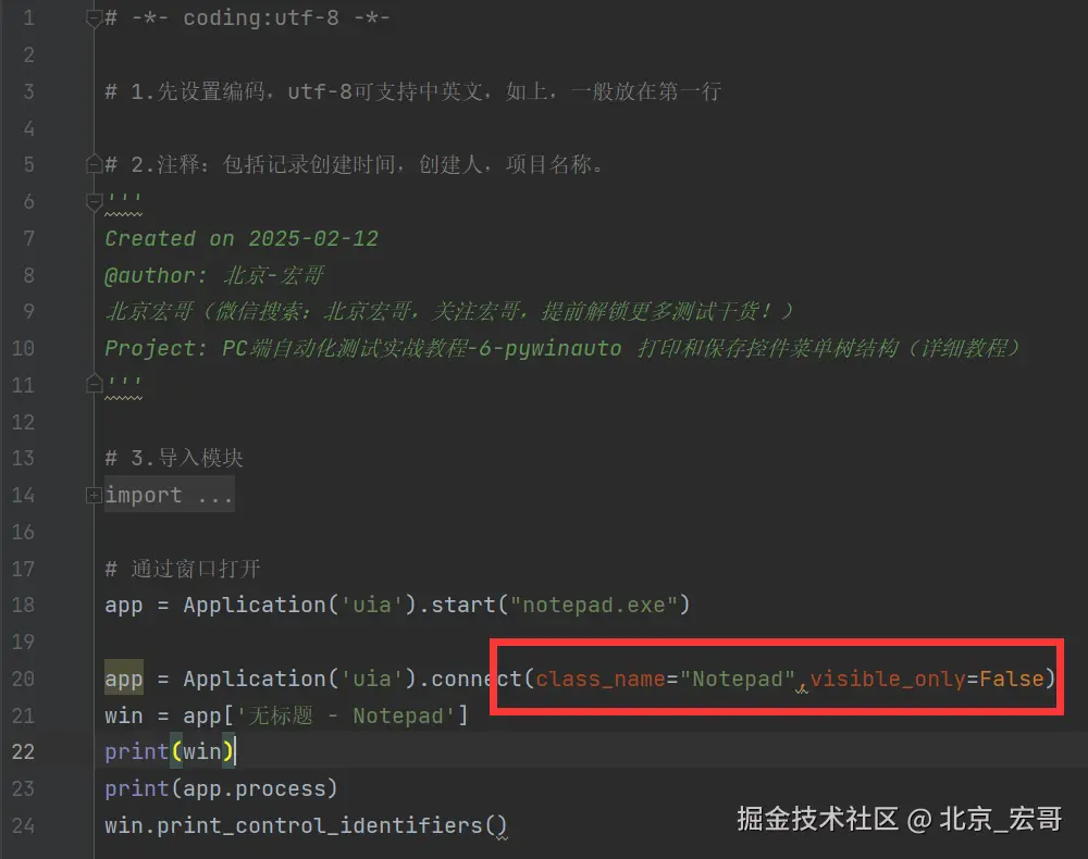 今天主要讲解和分享的是打印控件菜单结构树的方法:print_control_identifiers()在Windows10系统和Windows11系统上遇到的问题:pywinauto.findwindows.ElementNotFoundError: {'best_match': 'Untitled - Notepad', 'backend': 'uia', 'process': 31680} ,如何遇到,然后宏哥是怎么一步一步解决的,但是其中的原理宏哥还是有点懵,好在是问题暂时解决了。其实回过头来看走过的路,其中有一些走弯路了,当时由于宏哥急于解决问题,没有仔细思考,第一步已经发现进程号都不一样了,什么等待啊、改路径等等全是白扯,根本解决不了问题。现在问题解决了,按照解决问题思路宏哥倒退一下是原理:PC端程序启动后,慢慢在后台加载界面程序,这时宏哥加了等待,然后等待程序加载完成,宏哥然后连接这个加载好的应用程序,这样就确保PC端启动的程序和连接的程序一样(进程号一致),然后执行控件结构树的打印,就不会找不到了。因此等待和连接二者缺一不可,前边宏哥也将而这分开实践了,解决不了问题,仍然报错。二者结合问题解决。
