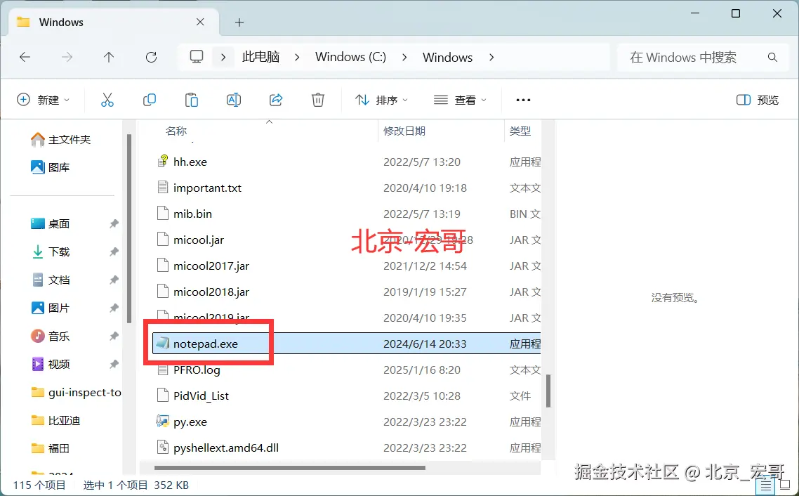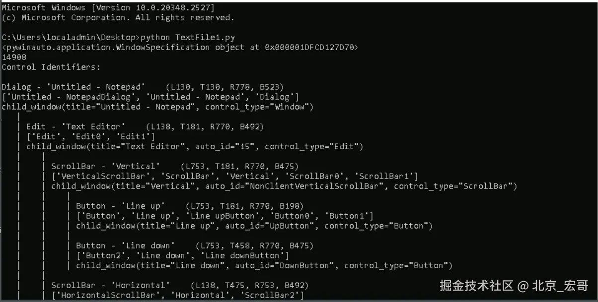其实前边的文章宏哥已经在控制台打印过控件菜单树结构,只是没有将其保存到文件中。只需要一个方法即可。在pywinauto中可以使用 print_control_identifiers() 方法打印控件菜单树结构,这对我们查找控件非常方便。宏哥今天将其单独拎出来是因为Windows10系统和Windows11系统会有一个坑,而且宏哥掉里边了,查了好多资料都没有找到解决办法,最后还好通过自己各种尝试将坑填平,成功爬出来了。其实前边已经遇到了打开记事本最后替换成了notepad++。今天跟随宏哥一步步入坑,然后再一步步填坑,最后成功解决。