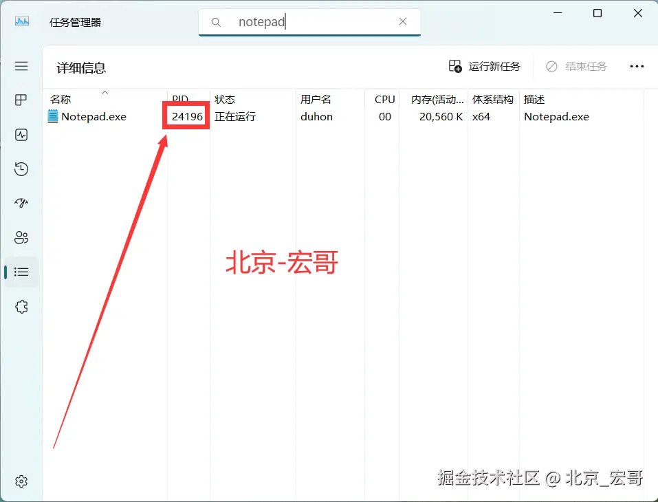 2.然后宏哥查看笔记本电脑的任务管理器的记事本的进程号是:24196 ,如下图所示: