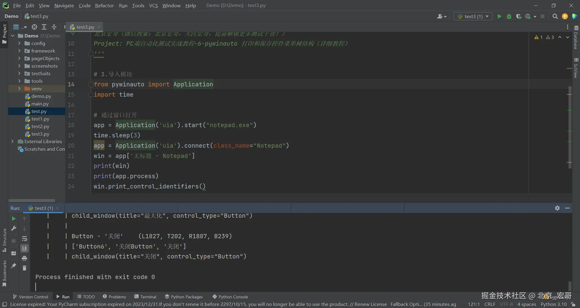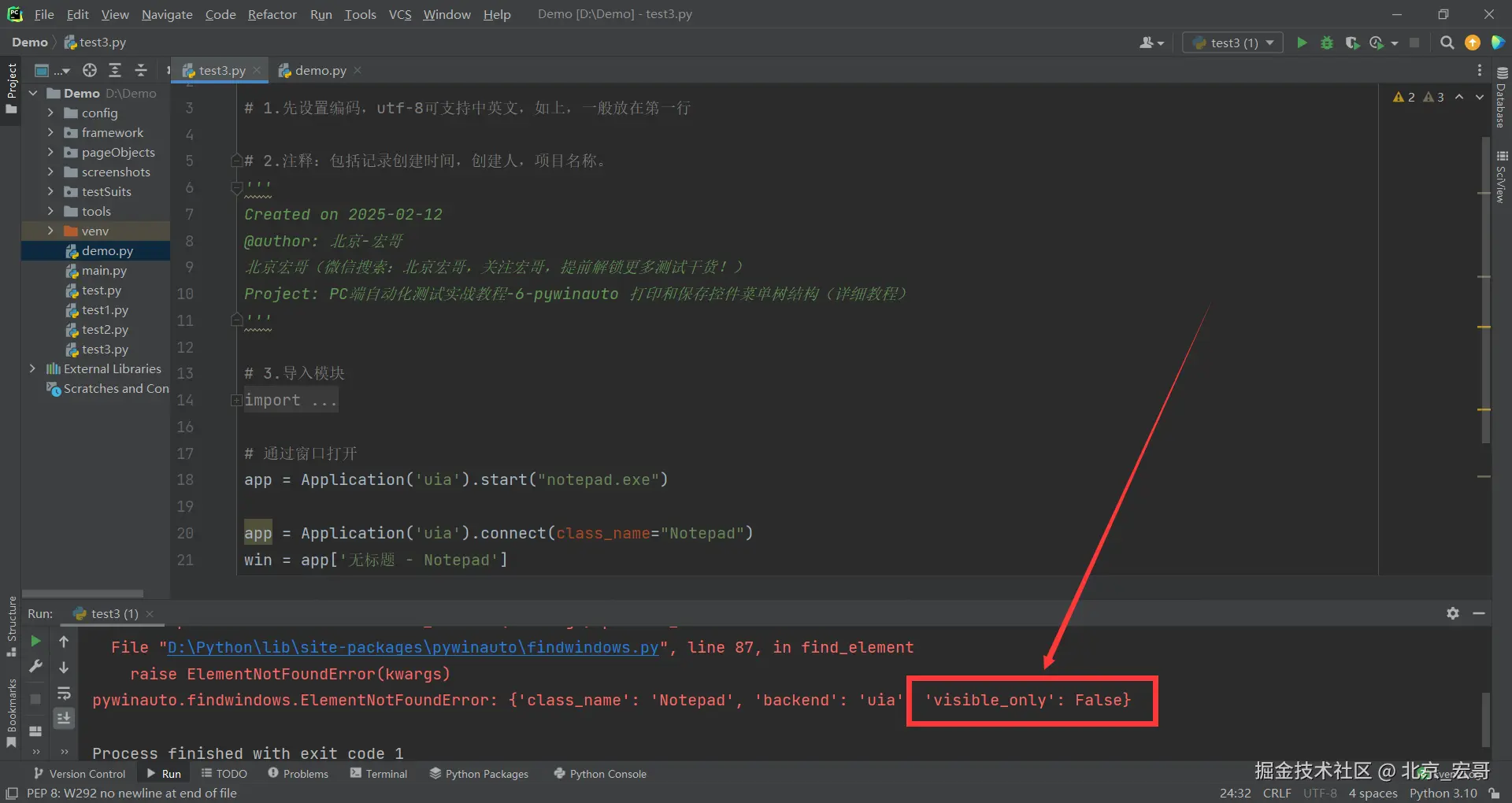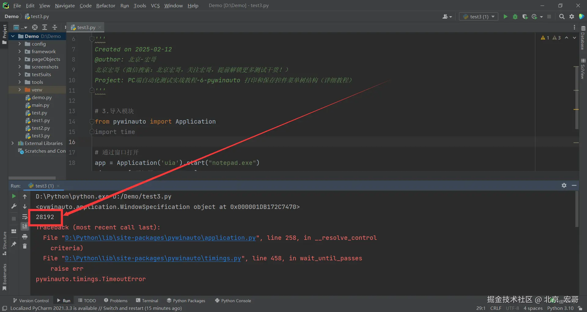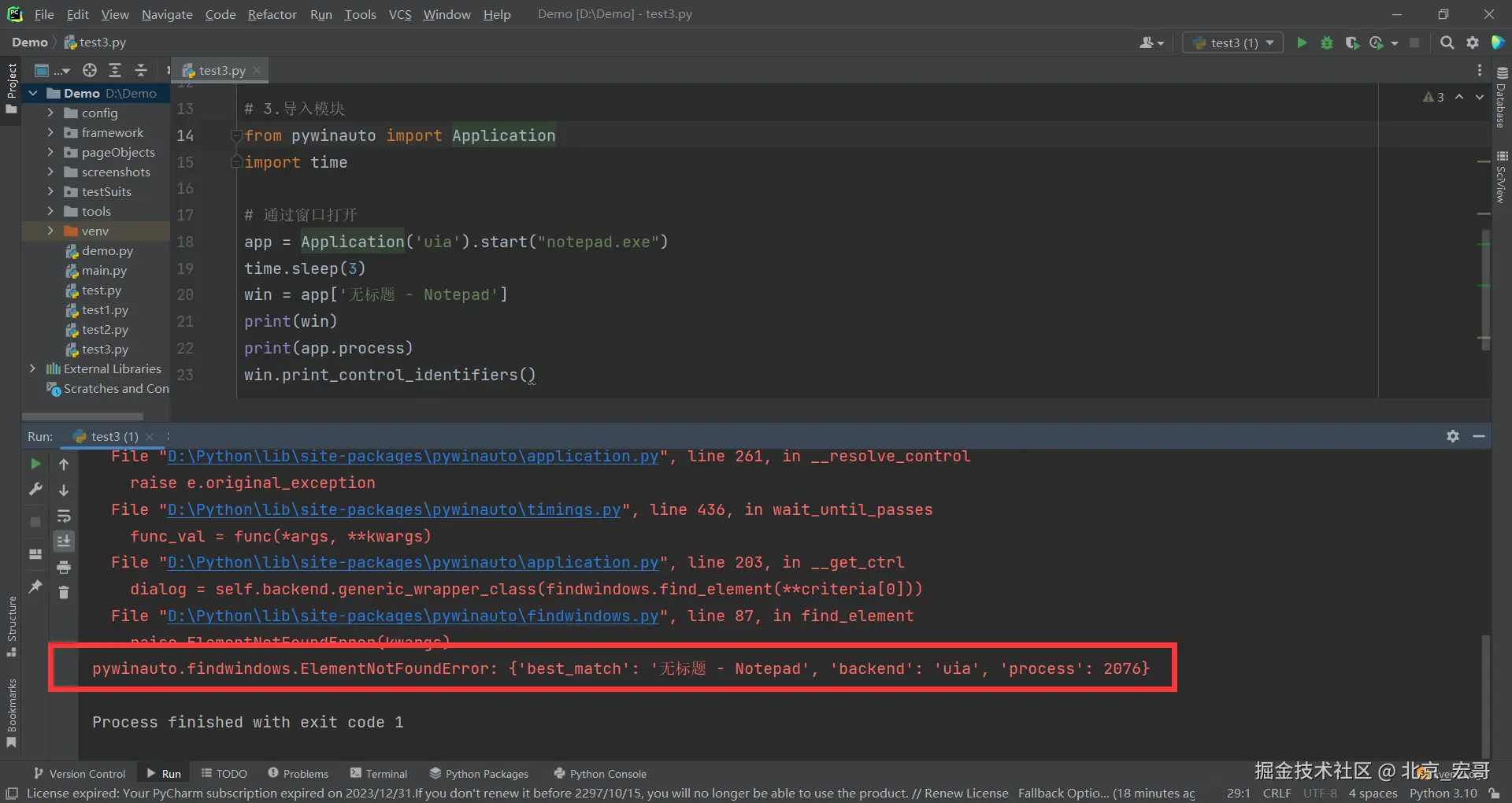 1.宏哥出差了,然后想也没想就将上边在Windows10系统运行成功的代码拷贝到笔记本Windows11系统上的Pycharm中进行运行,结果报错了:pywinauto.findwindows.ElementNotFoundError: {'best_match': 'Untitled - Notepad', 'backend': 'uia', 'process': 31680}