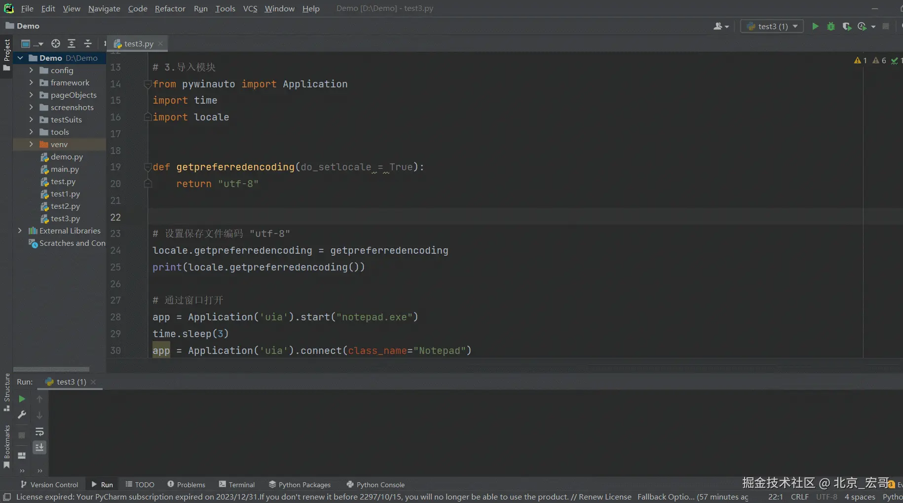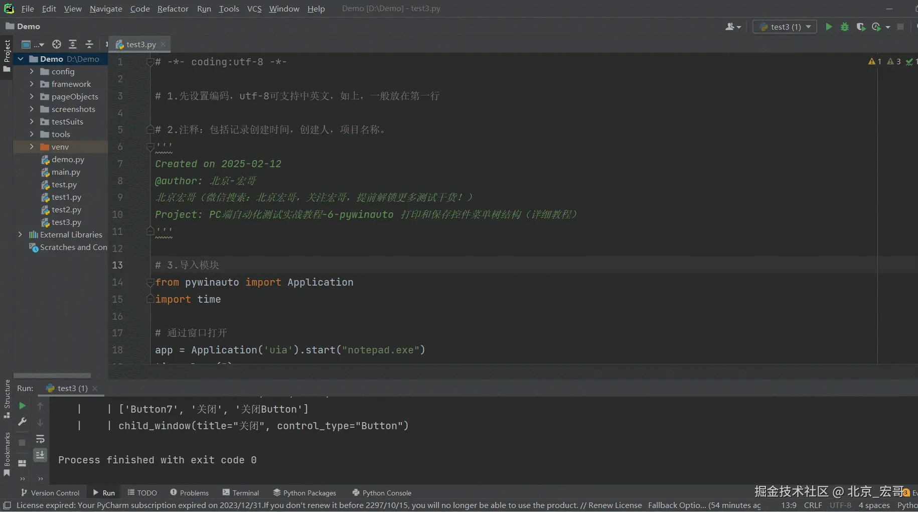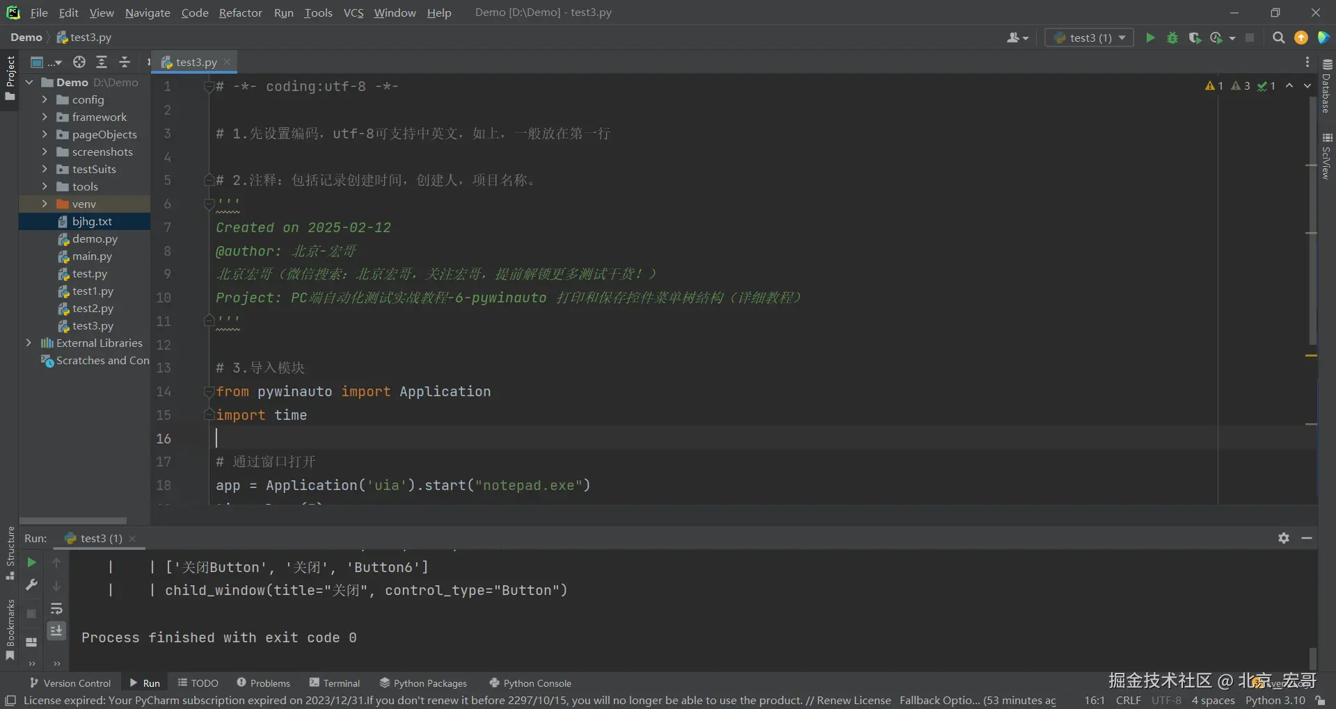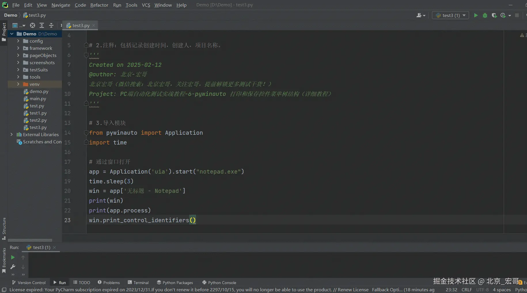 1.宏哥出差了,然后想也没想就将上边在Windows10系统运行成功的代码拷贝到笔记本Windows11系统上的Pycharm中进行运行,结果报错了:pywinauto.findwindows.ElementNotFoundError: {'best_match': 'Untitled - Notepad', 'backend': 'uia', 'process': 31680}